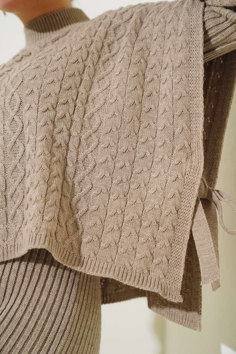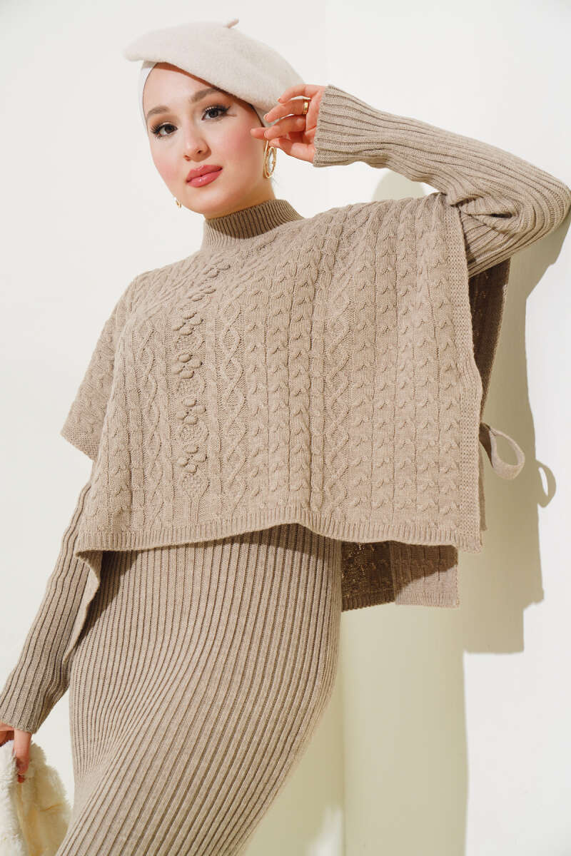 Taşlı Baklava Desen Triko İkili Takım Bej