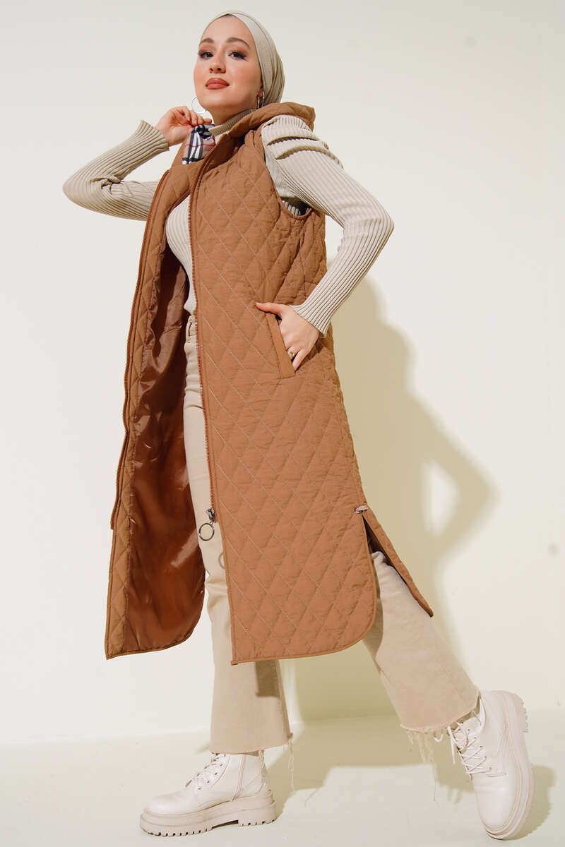 Kapüşonlu Kapitone Uzun Yelek Camel