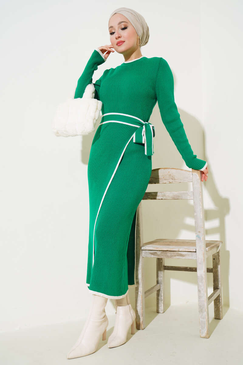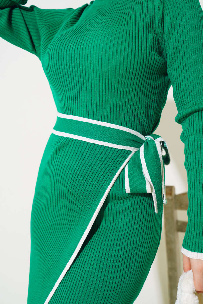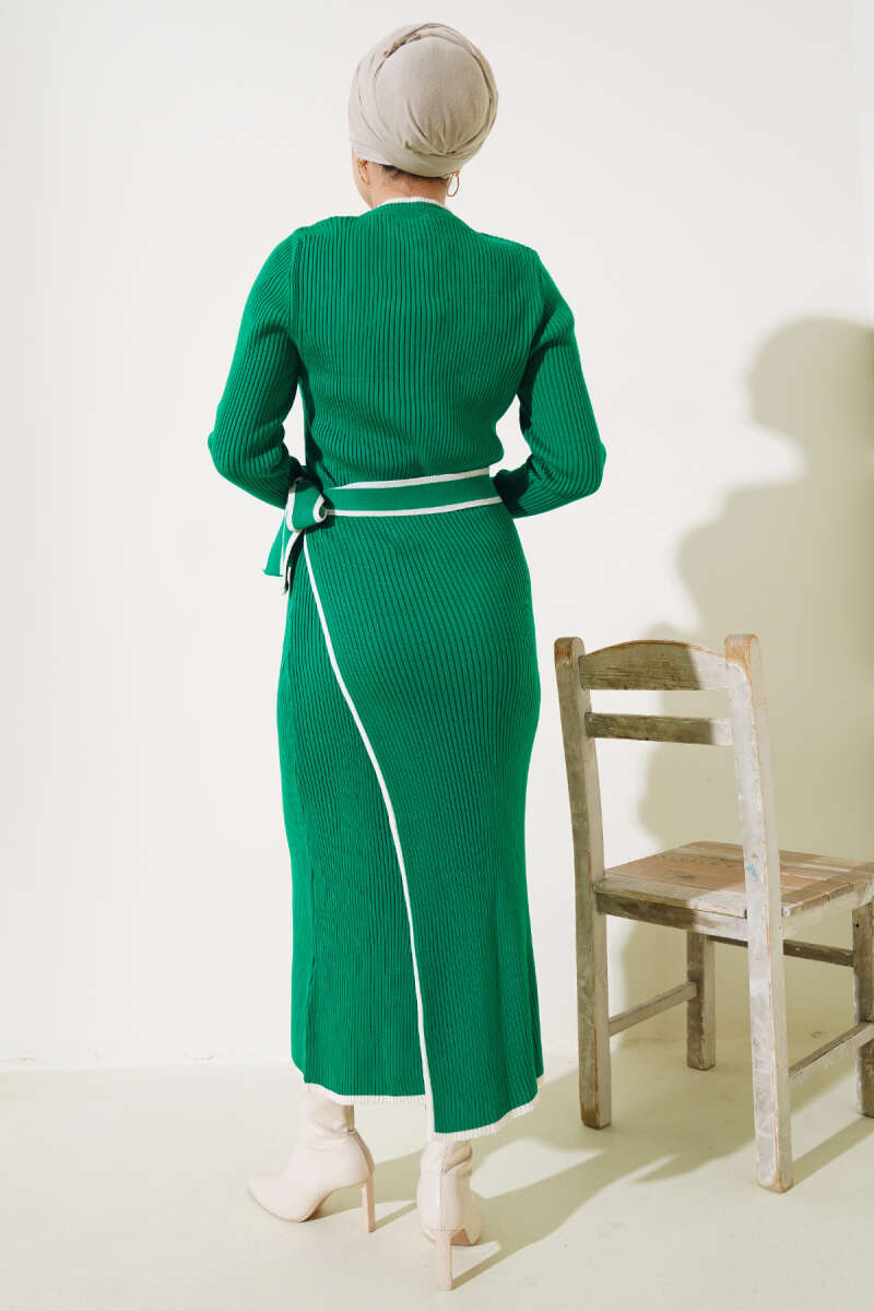 Çizgi Kabartmalı Triko Kazak Yağ Yeşili
