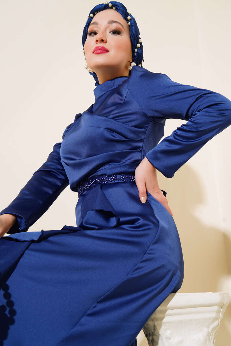 Eteği Fırfırlı Kuşak Bağlamalı Elbise Lacivert