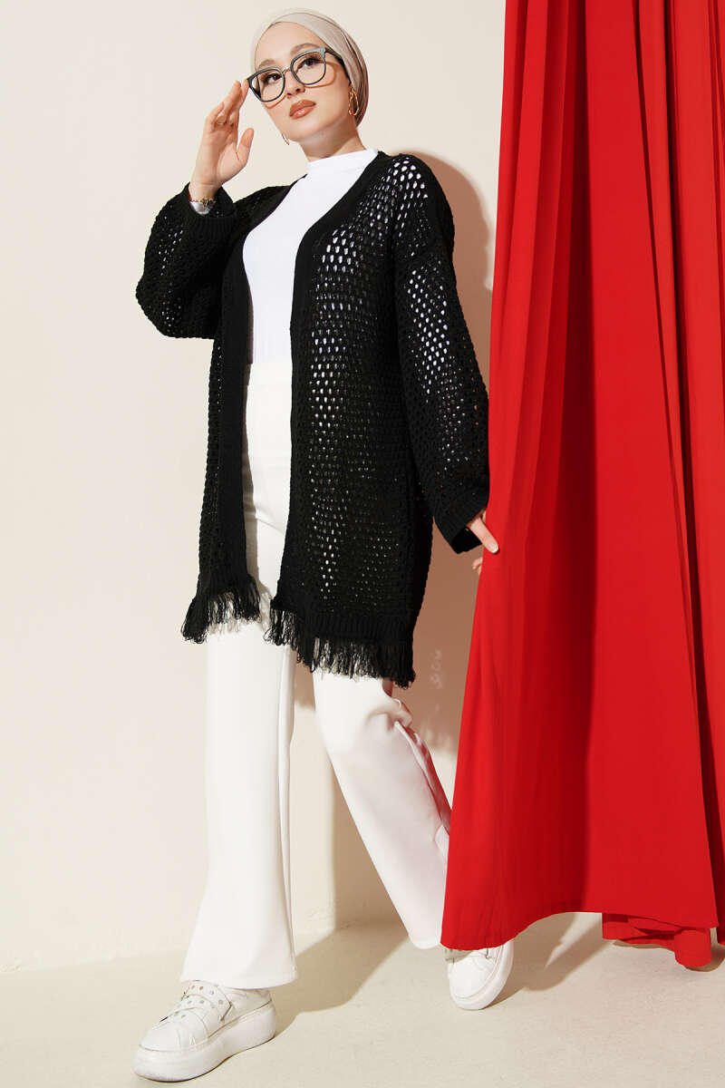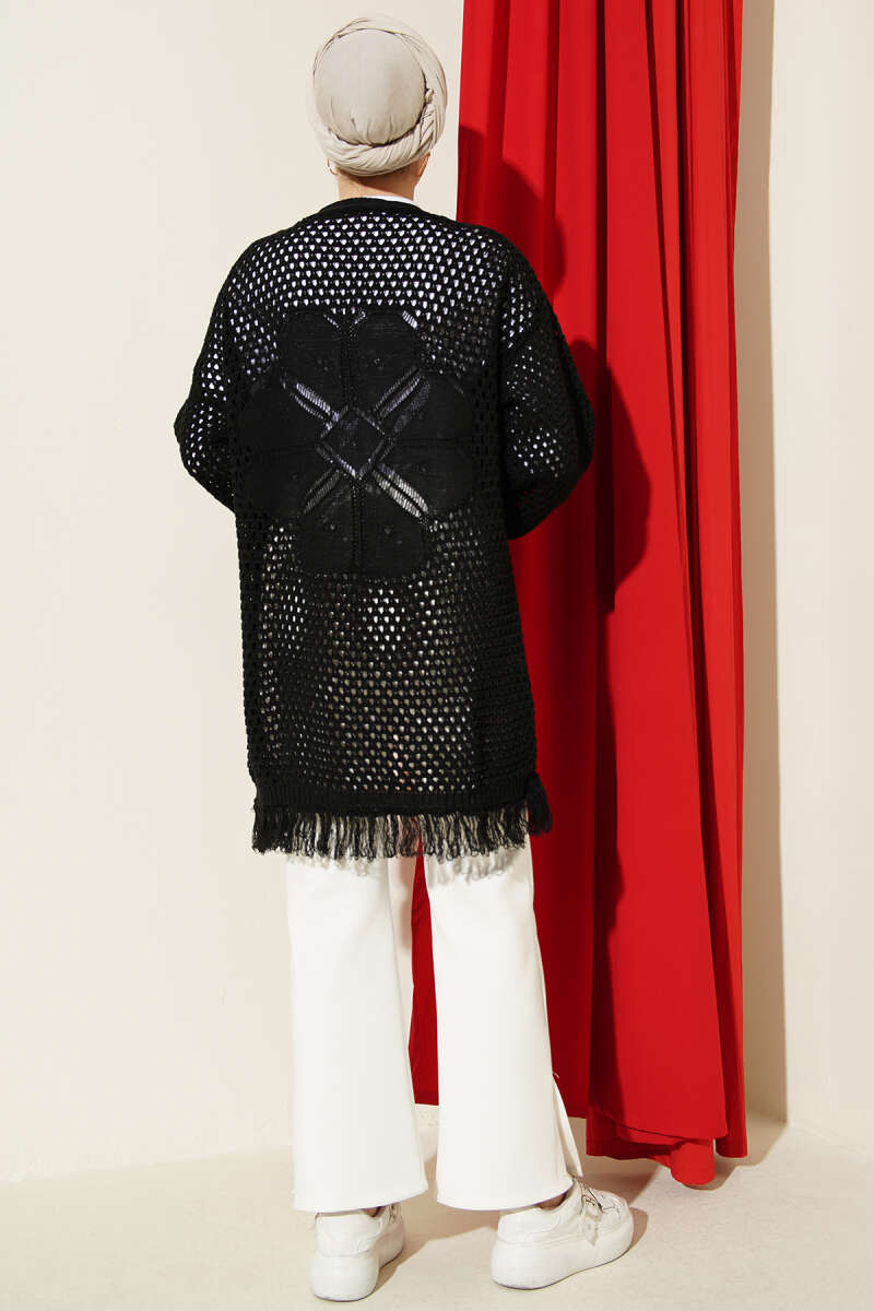 Eteği Püsküllü Ajurlu Triko Hırka Siyah