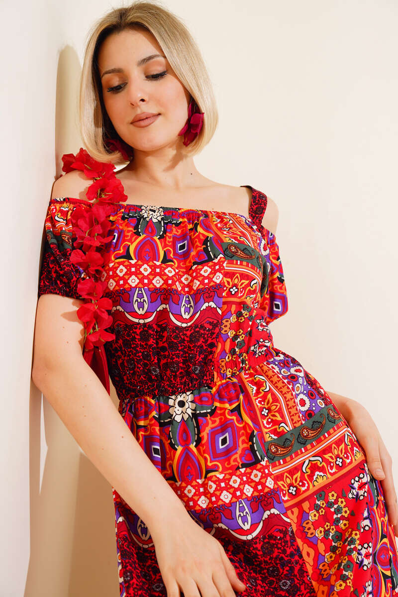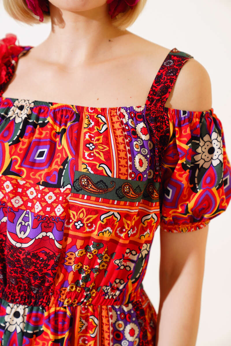 Eteği Volanlı Askılı Elbise Kırmızı