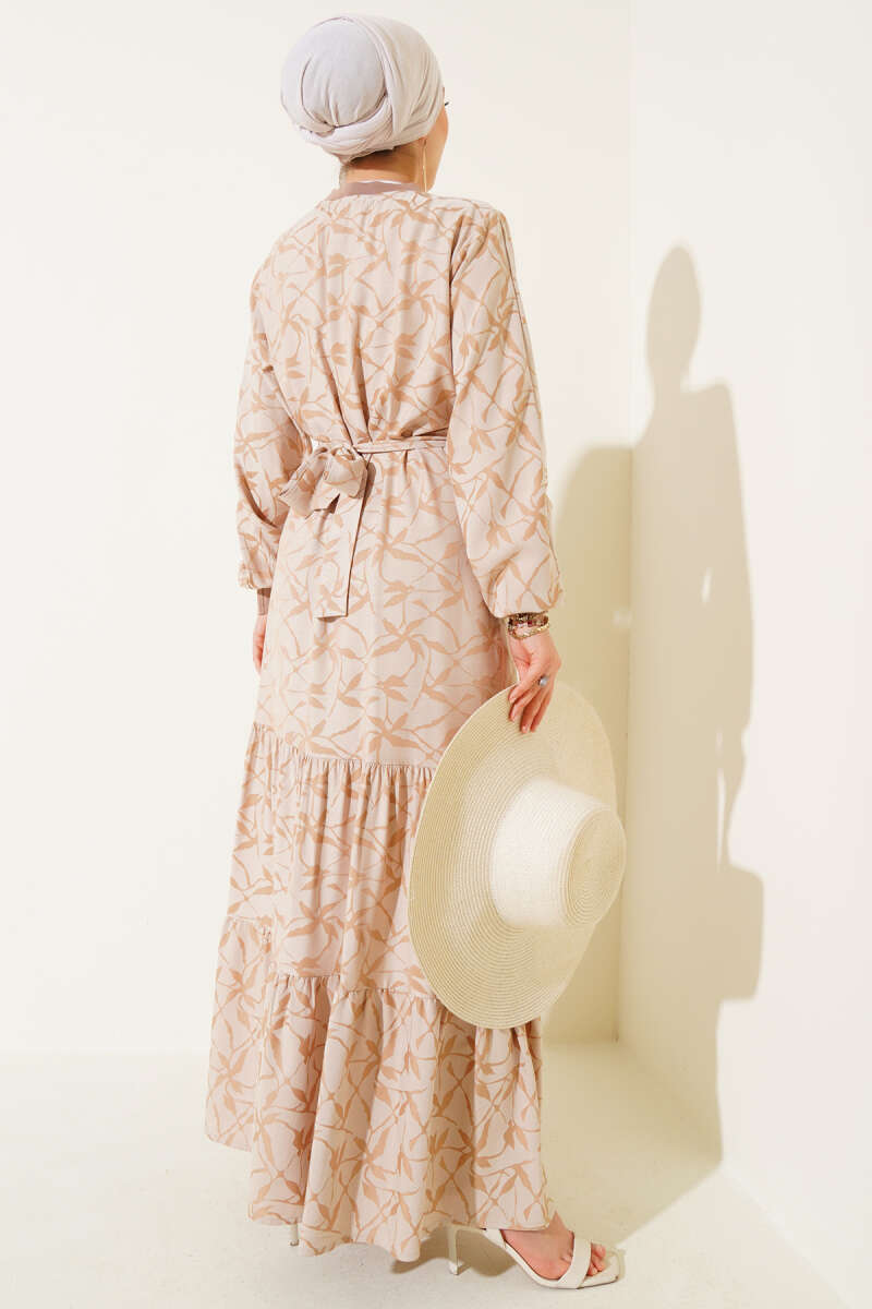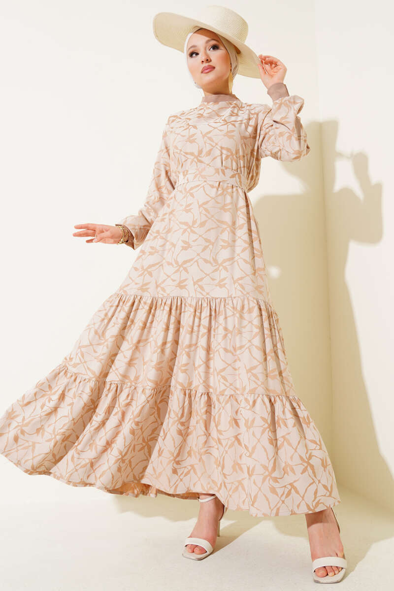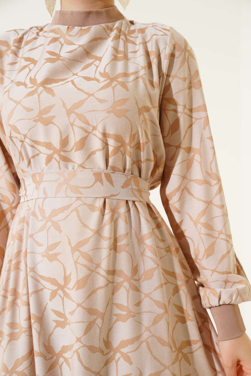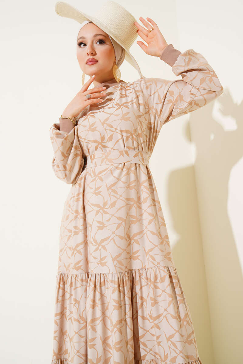 Etek Pileli Kol Pileli Desen Elbise Bej