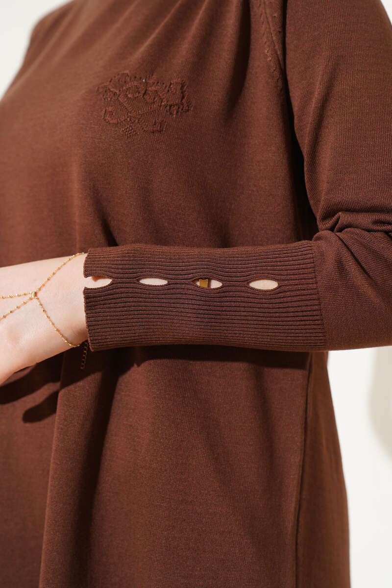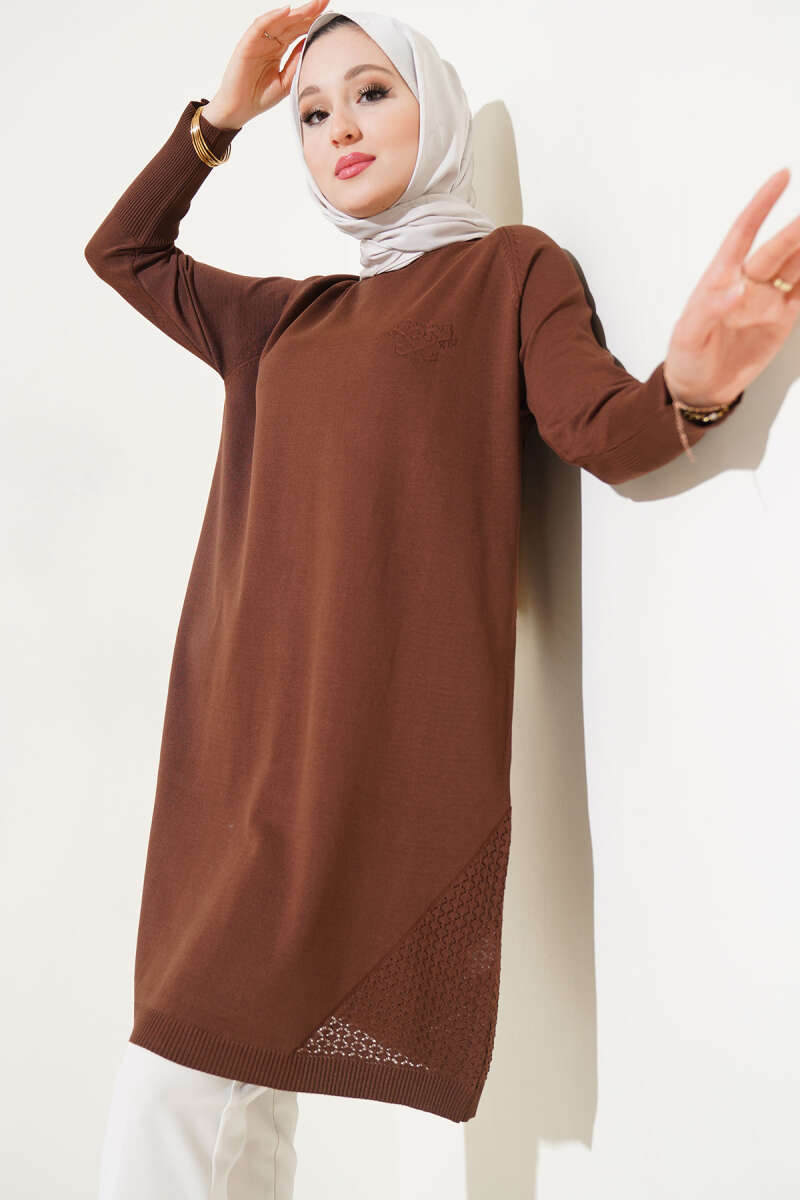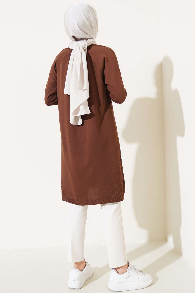 Yanı Yırtmaçlı Oversize Triko Tunik Kahve