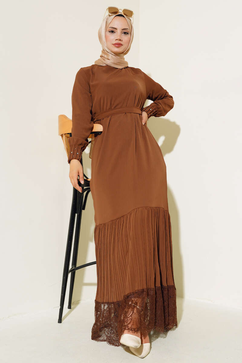 Etek Ucu Dantelli Elbise Kahve