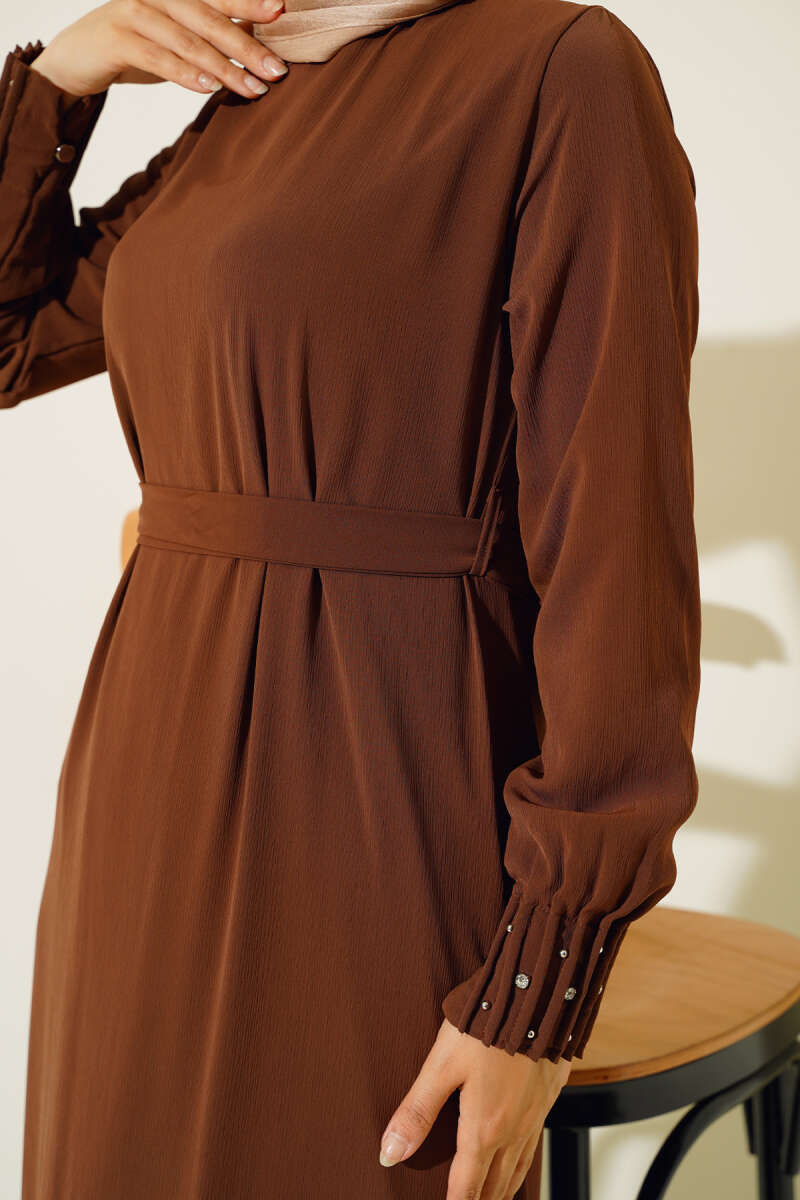 Kemerli Büzgü Dantelli Elbise Kahve