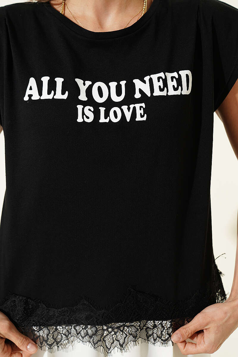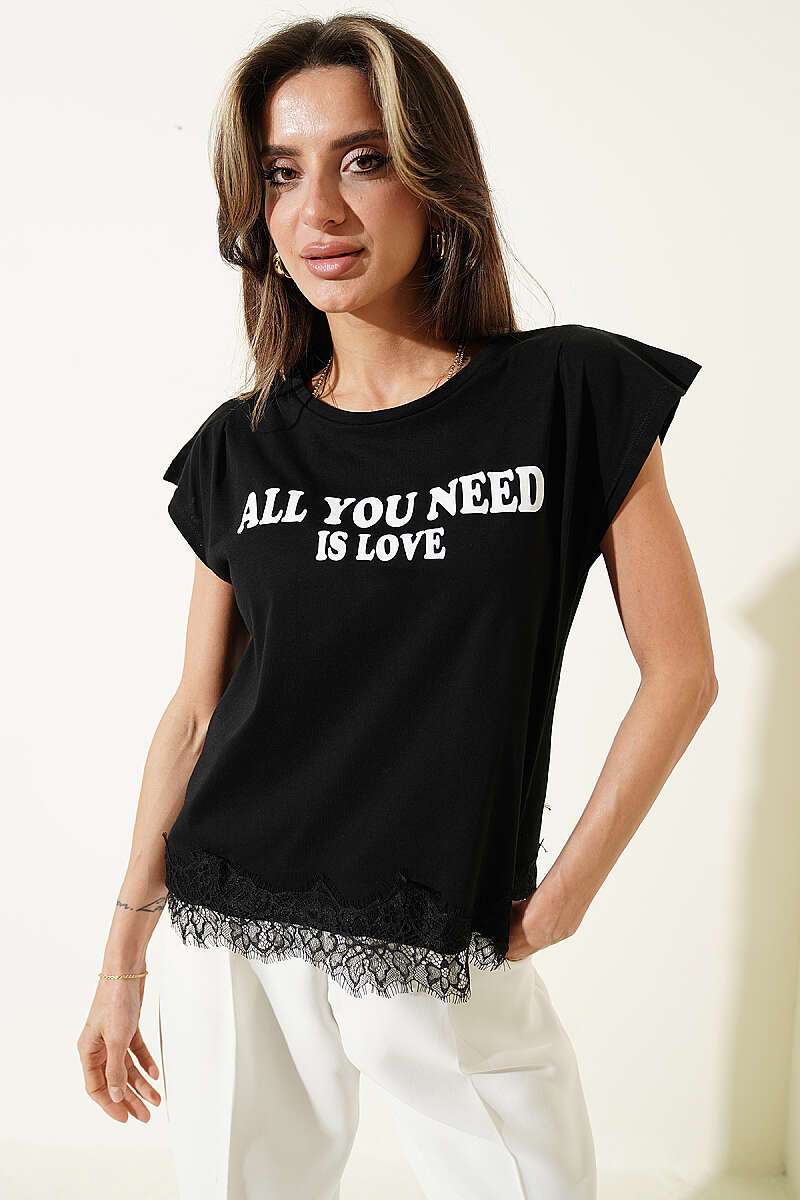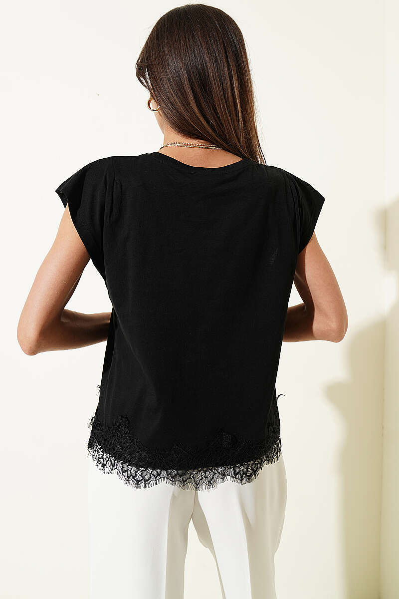Etek Ucu Dantelli Kolsuz T-shirt Siyah