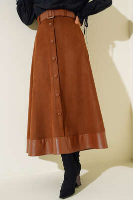 Yeni sezon eteğimiz şık bir kombin için tamamlayıcı parçadır. Etek ucu deri detaylı olan eteğimizin üzeri süettir. Kemeri bulunan eteğimizin dört adet kemer köprüsü bulunmaktadır. Boydan düğme süslemeli eteğimiz yandan fermuarlıdır. Şıklığınıza şıklık katacak eteğimiz dolaplarınızda yerlerini beklemekte.