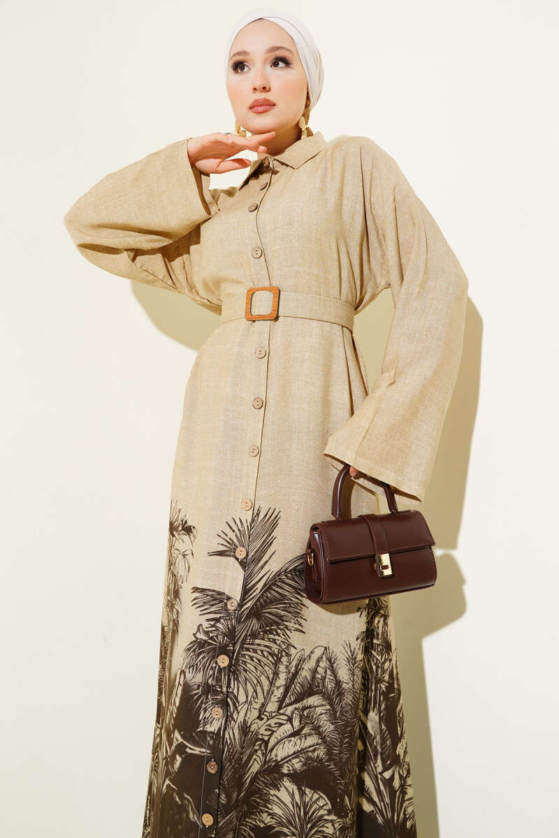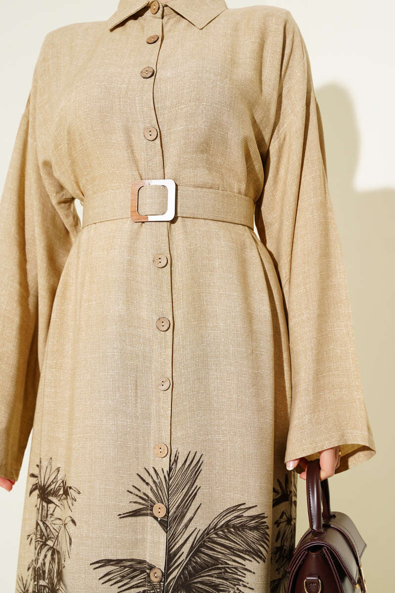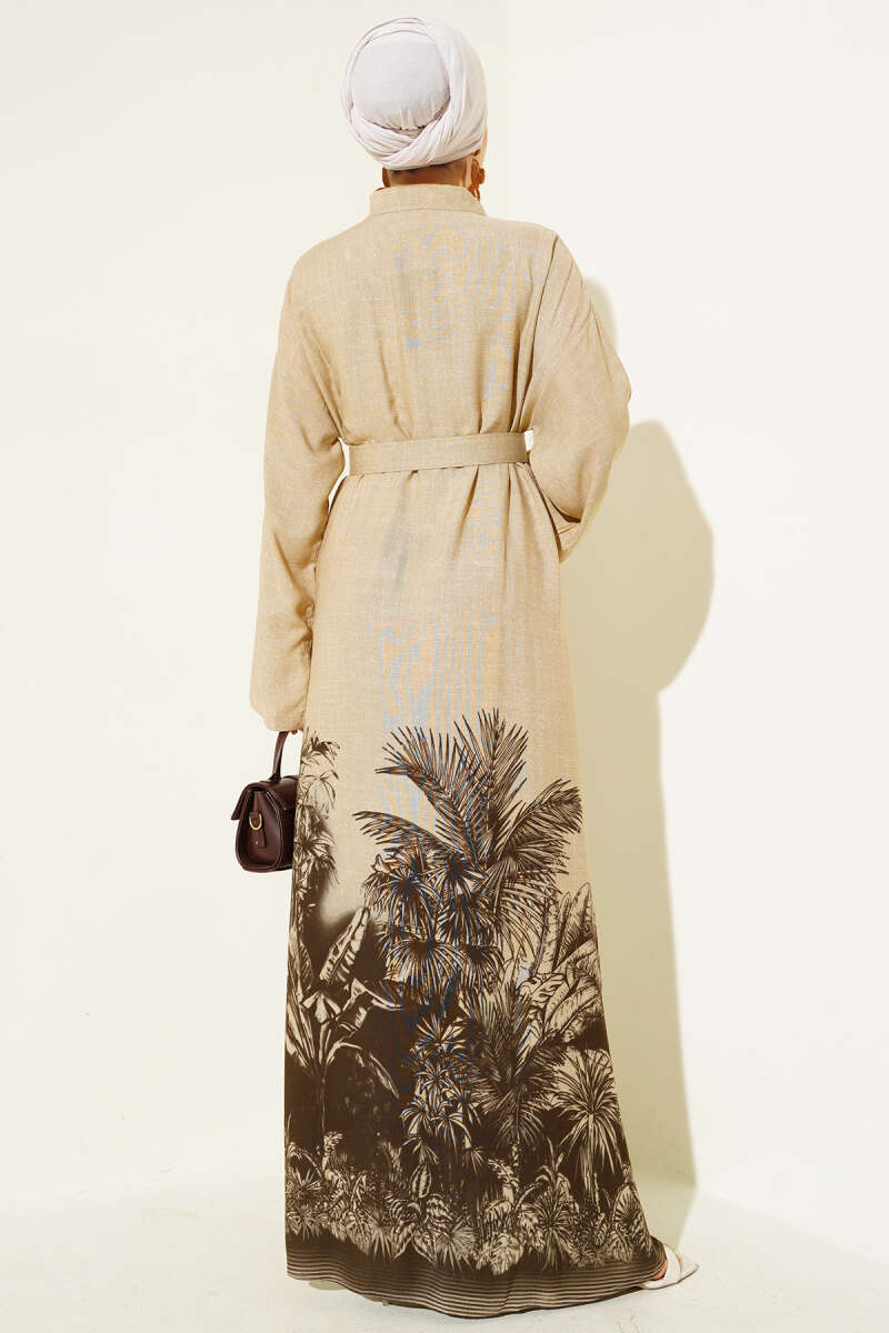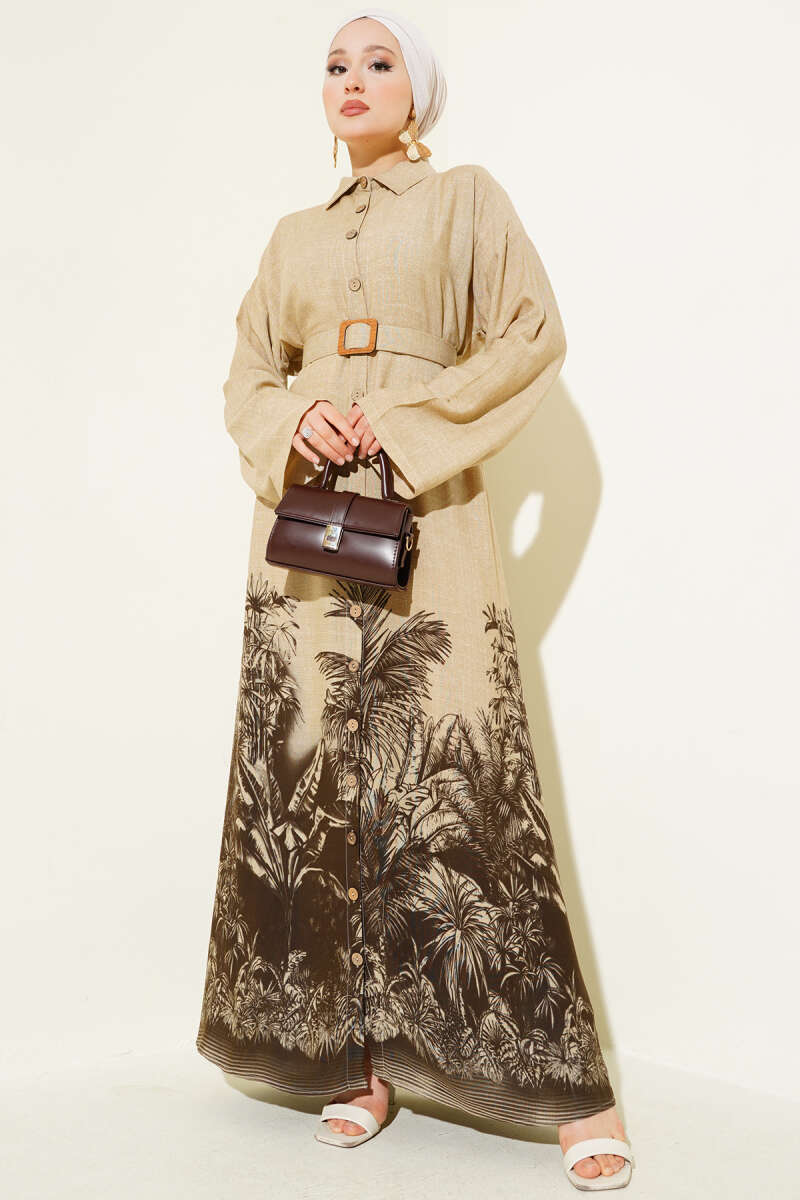 Etek Ucu Desenli Boydan Düğmeli Elbise Kahve