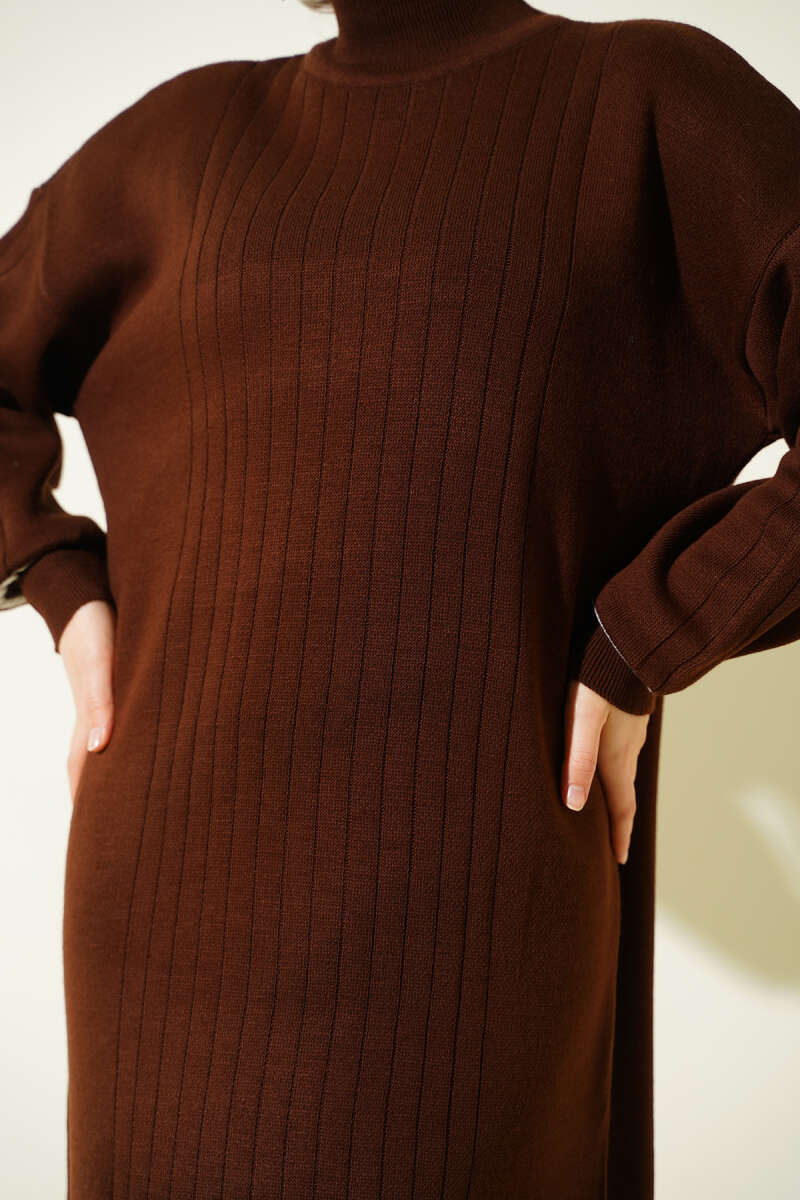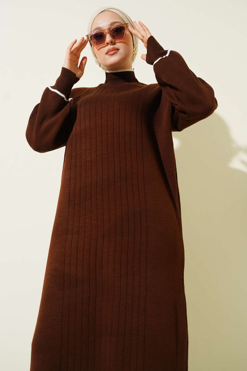 Düşük Omuz Salaş Triko Tunik Kahve