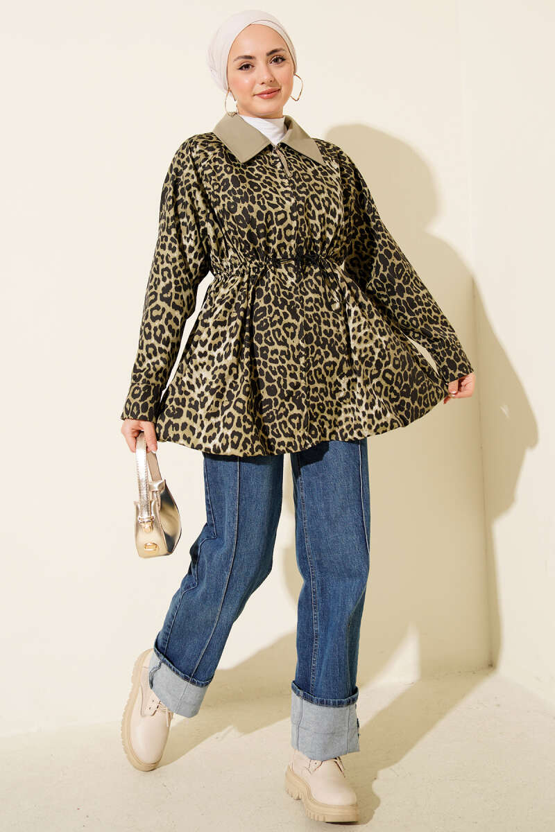 Etek Ucu Gizli Lastikli Leopar Trençkot Kahve
