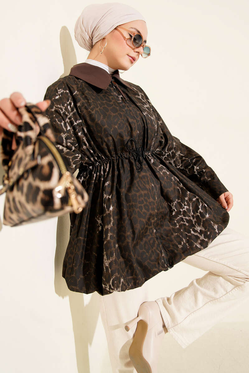 Leopar Desen Kadife Yaka Trençkot Kahve