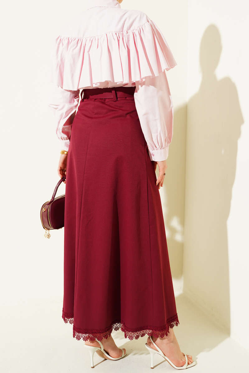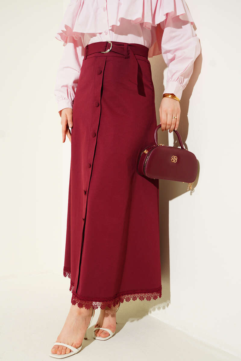 Etek Ucu Güpürlü Düğme Detaylı Etek Bordo