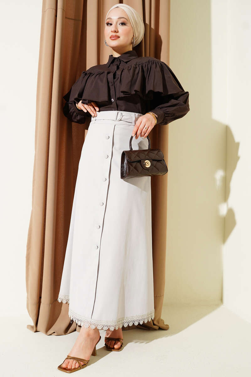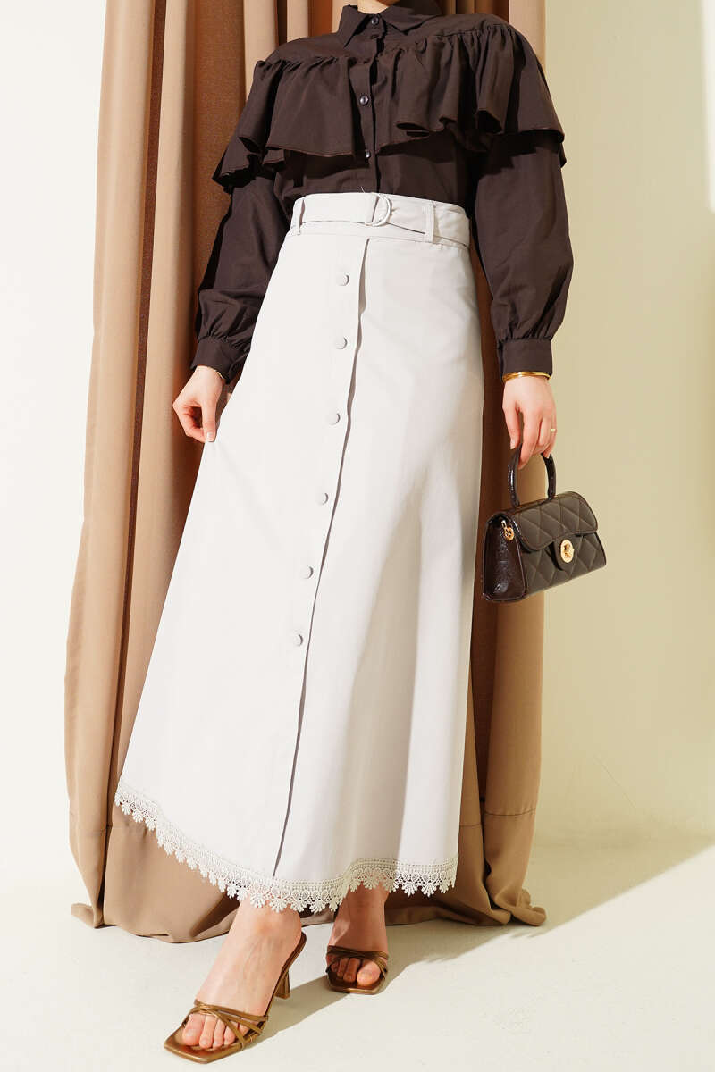 Etek Ucu Güpürlü Düğme Detaylı Etek Taş