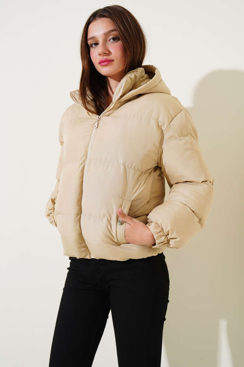Etek Ucu Lastikli Kapüşonlu Kısa Şişme Mont Bej