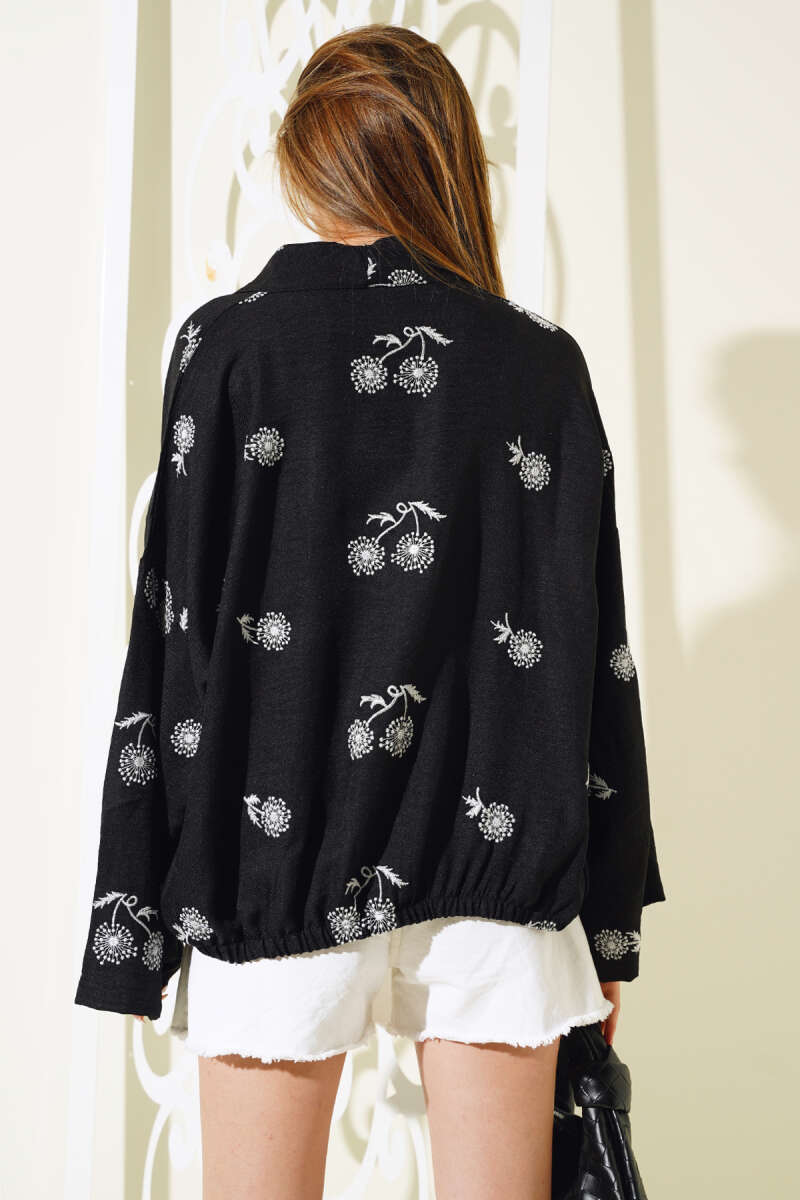Bilek Püsküllü Nakışlı Keten Kimono Taş