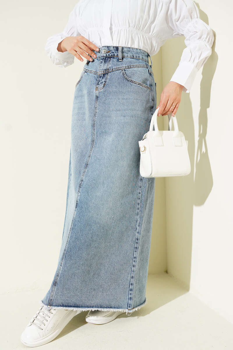 Etek Ucu Püsküllü Jean Etek Kot Mavisi