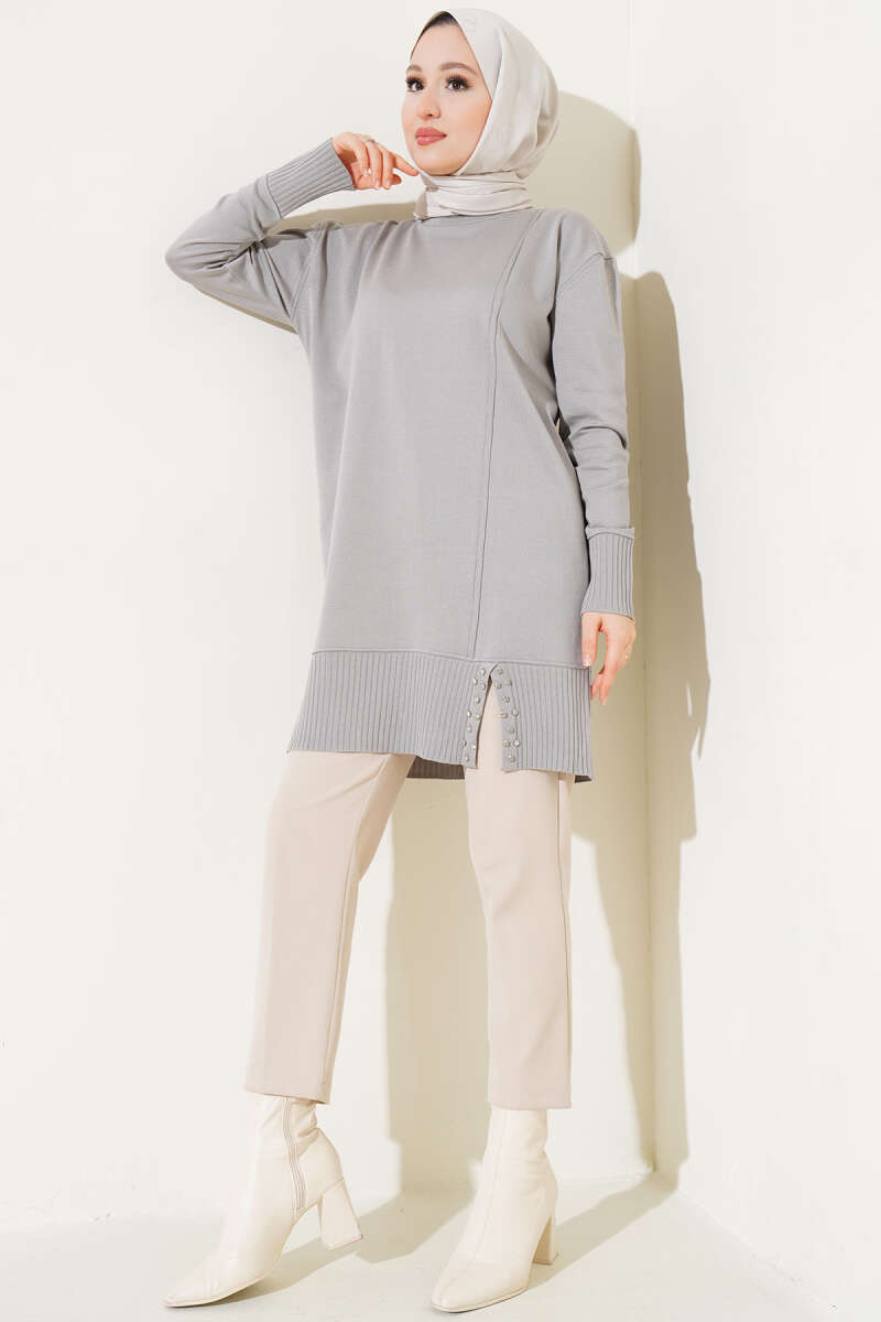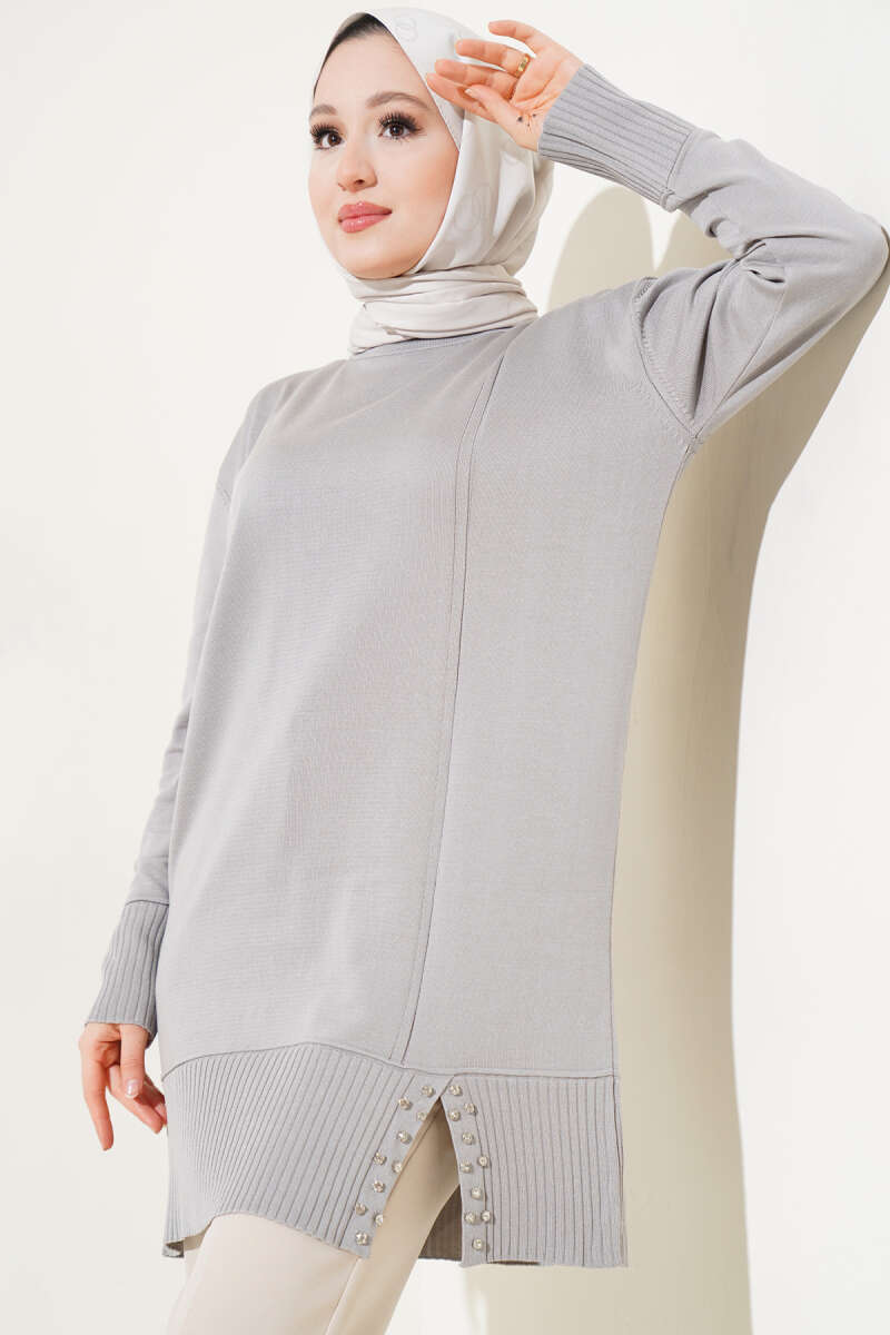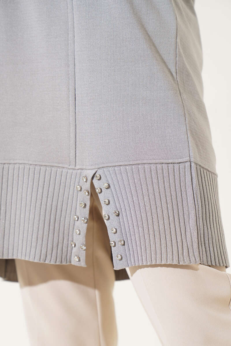 Etek Ucu Taşlı Triko Tunik Gri