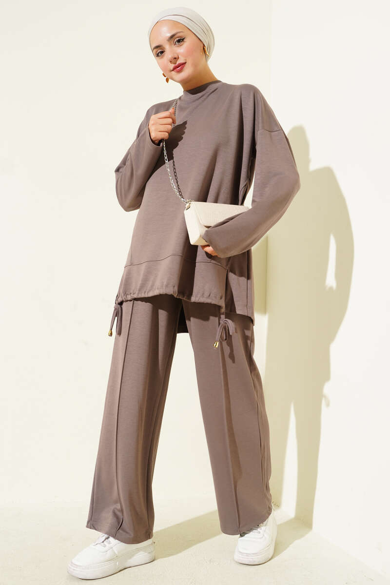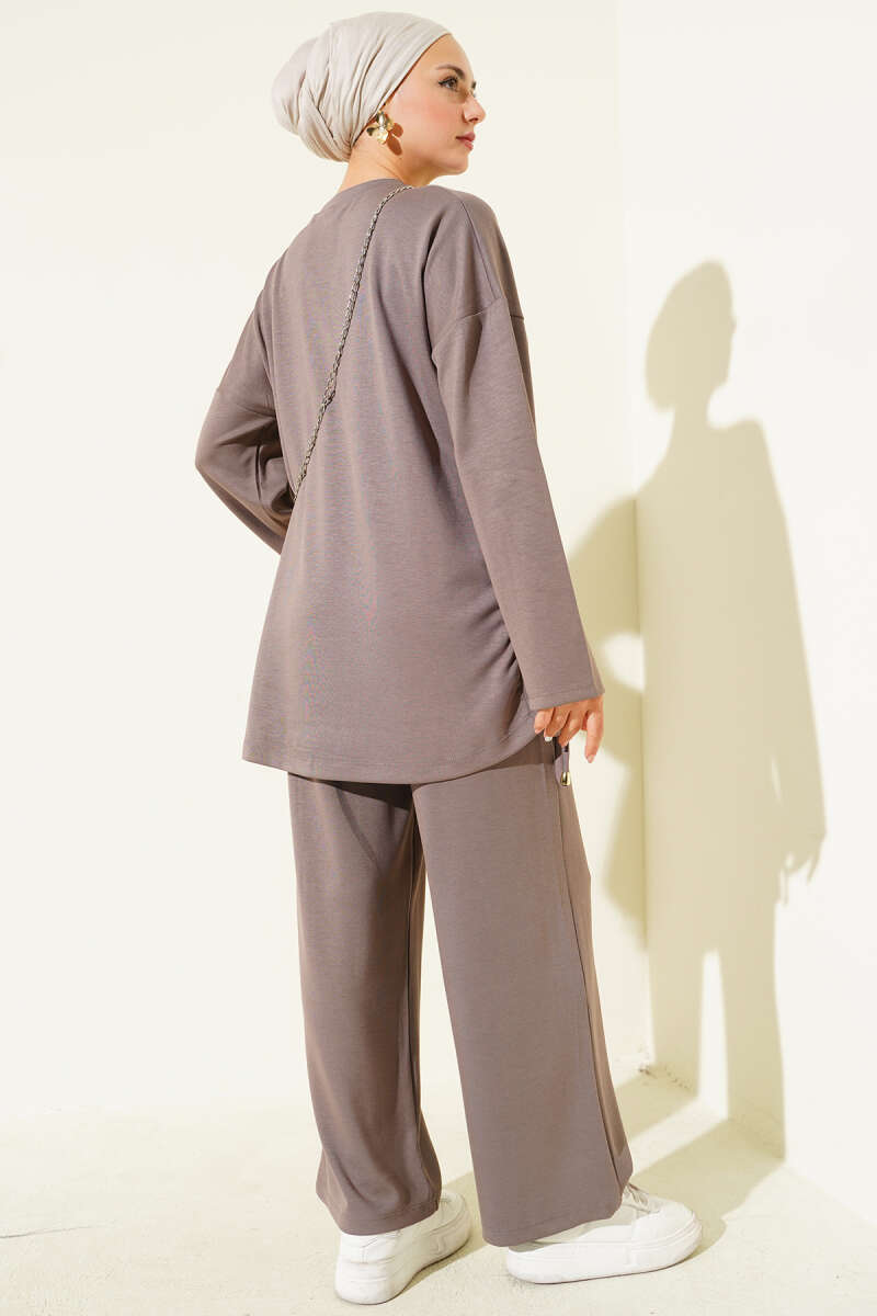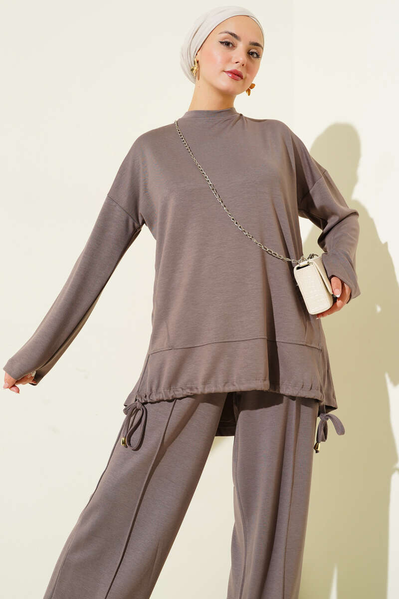 Brit Düğme Detaylı İp Kuşaklı İkili Takım Kahve