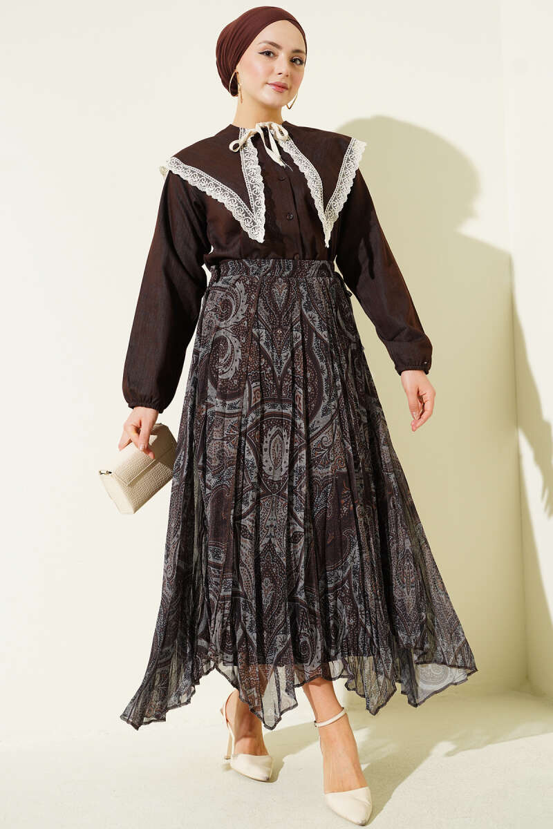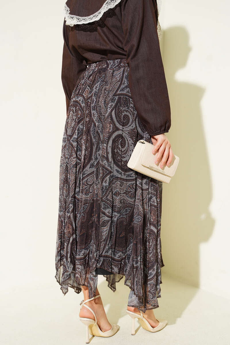 Etnik Desen Asimetrik Şifon Etek Kahve
