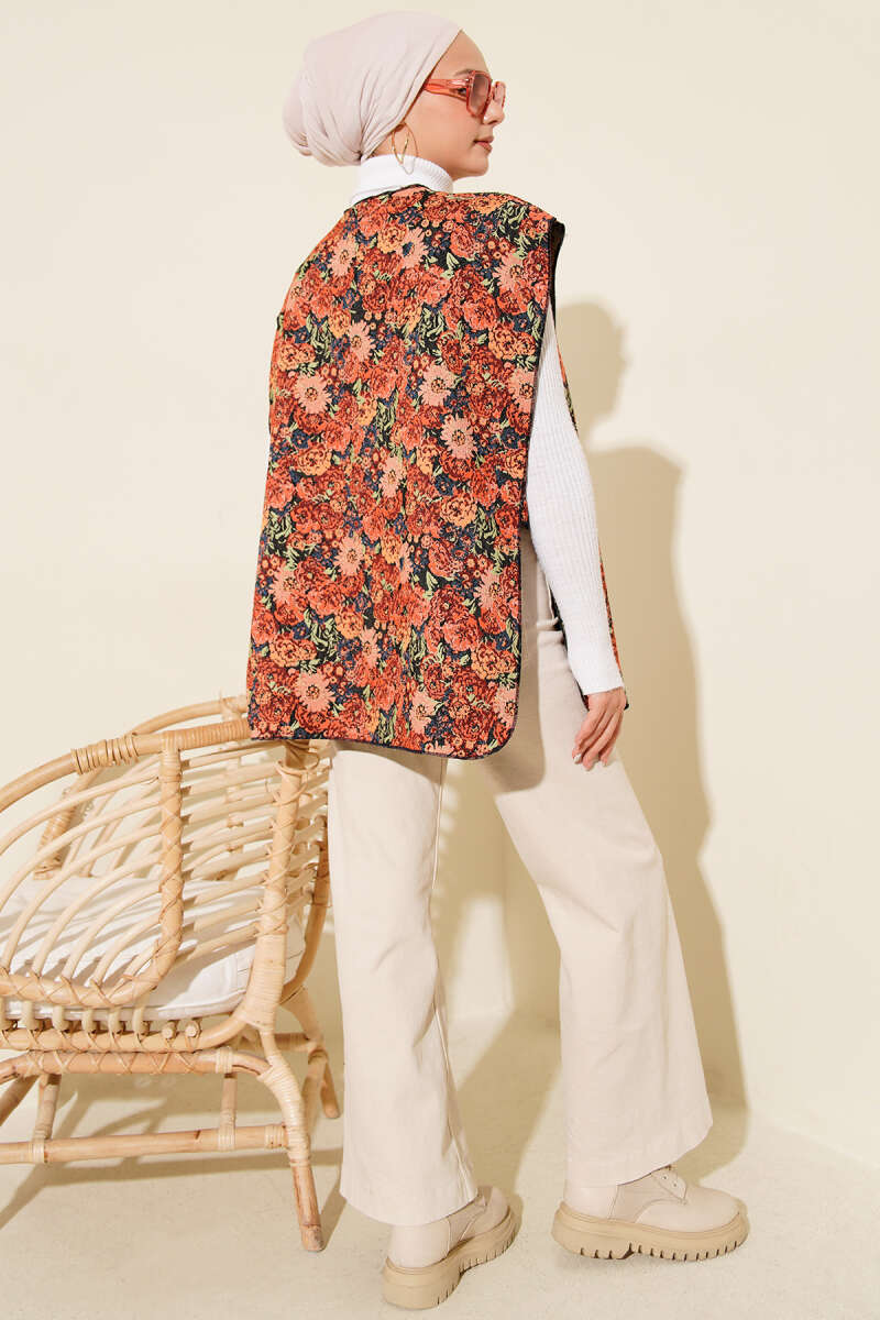 Etnik Desen Çıtçıtlı Yelek Kiremit