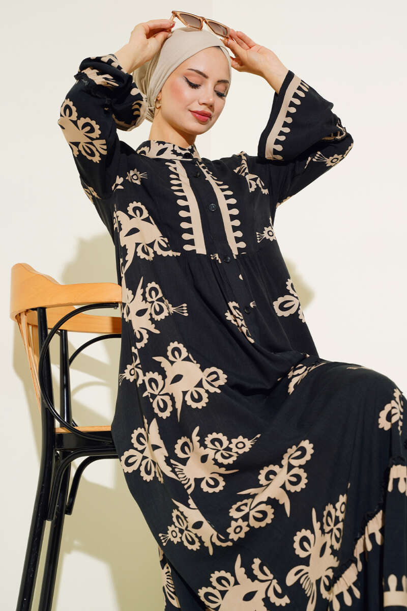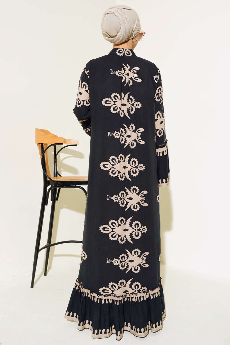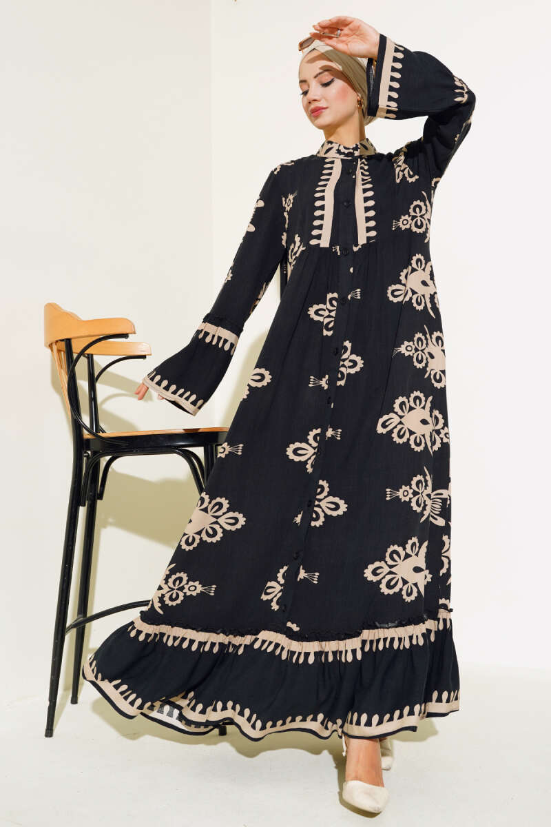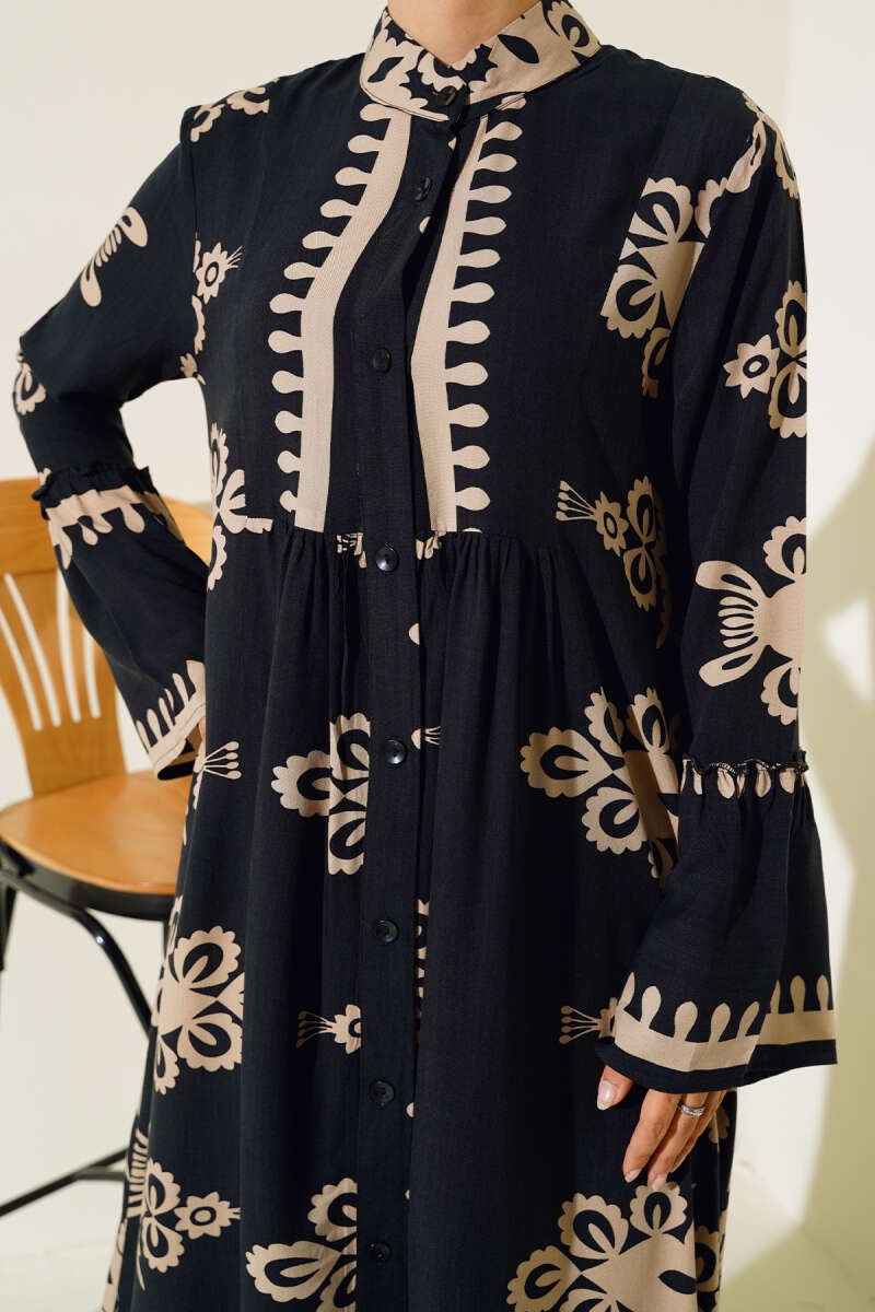 Etnik Desen Düğmeli Salaş Elbise Siyah