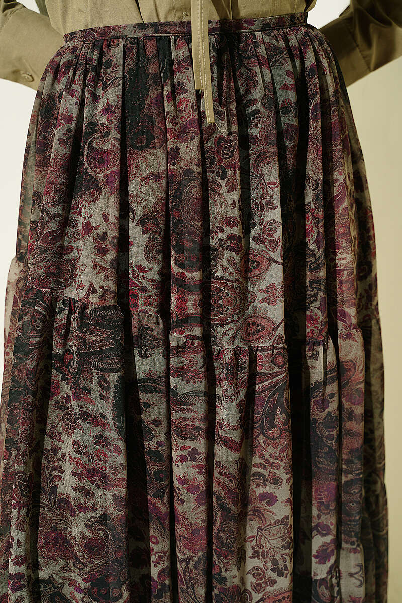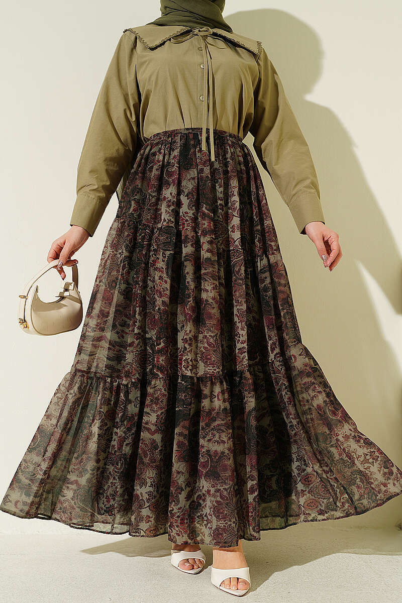 Bu etek, geleneksel çizgileri modern bir formla buluşturan etnik desenleri ve uçuş uçuş şifon kumaşıyla dikkat çeken zarif bir parçadır. Tasarımındaki katlı kesim detayları, eteğe feminen bir hacim kazandırırken her adımda dinamik ve akıcı bir görünüm sergilemenizi sağlar. Bel kısmındaki esnek yapı sayesinde gün boyu konfor sunan bu model, şıklığı ve rahatlığı bir arada arayanlar için ideal bir tercihtir. Hem günlük kombinlerde hem de daha özel davetlerde bohem bir tarz oluşturmak için gardırobunuzun kurtarıcı parçalarından biri olmaya adaydır.