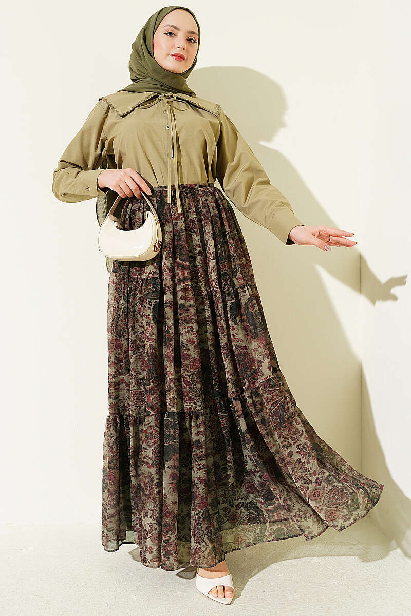 Pileli Kuşaklı Ekoseli Şifon Etek Haki