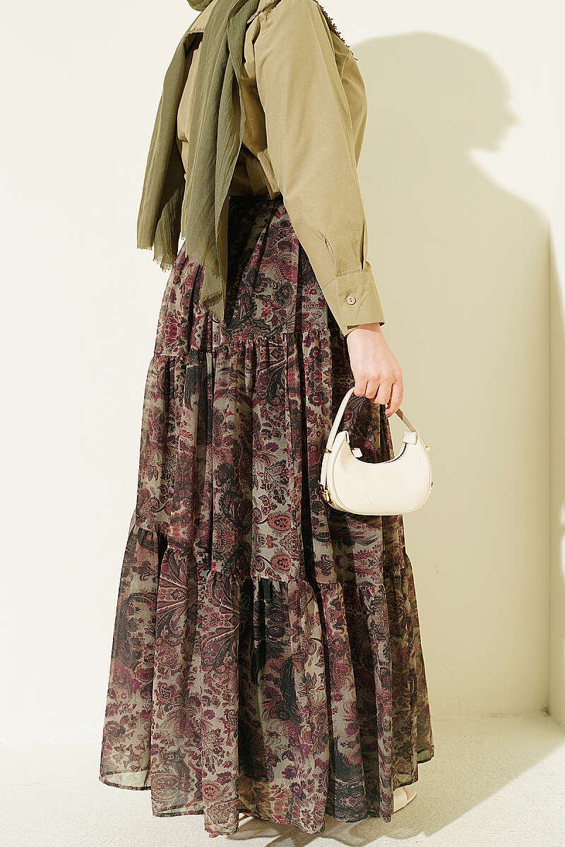 Ekoseli Bel Fermuarlı Şifon Etek Mürdüm