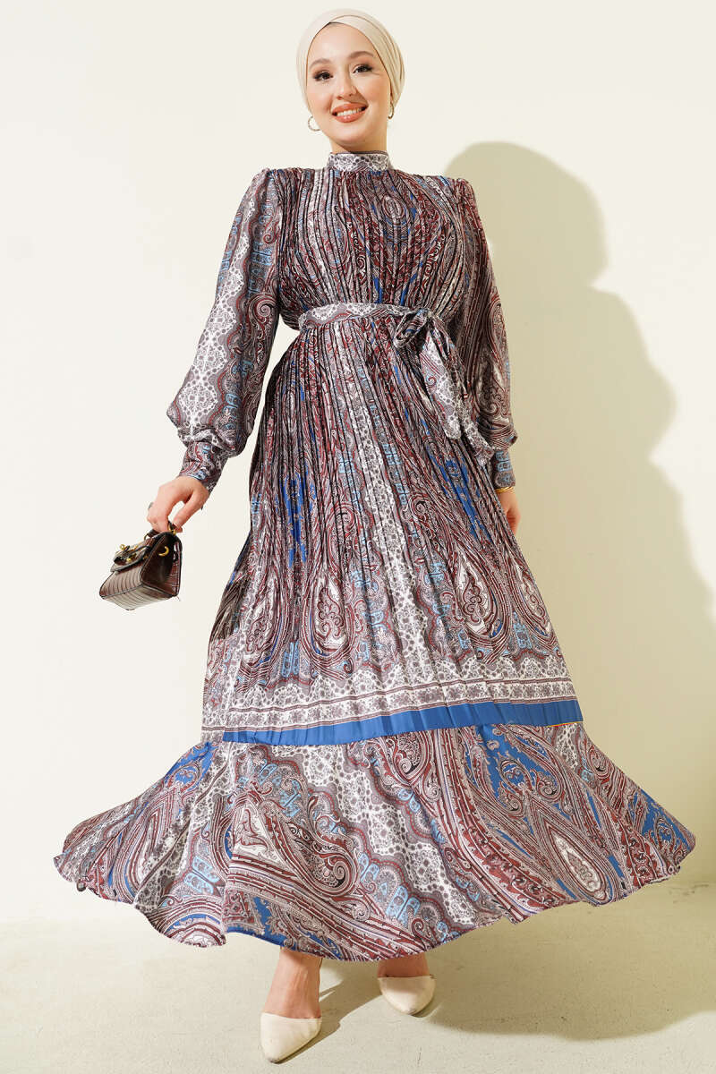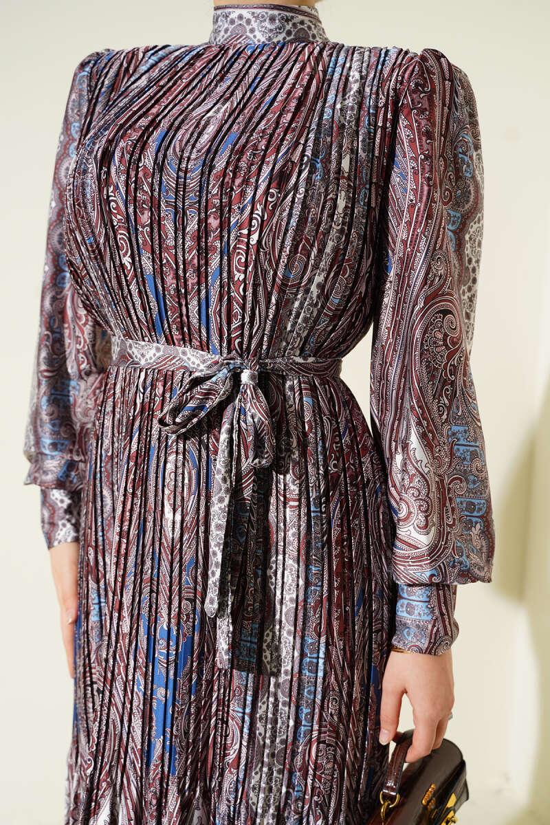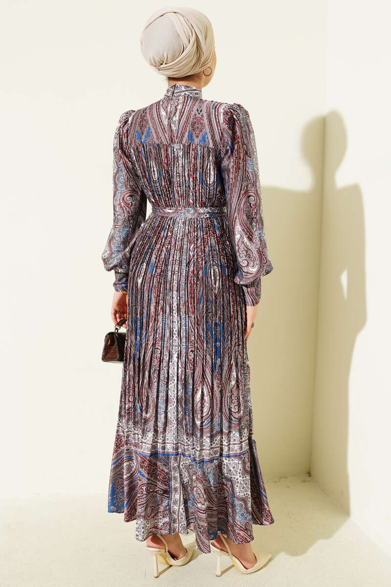 Etnik Desen Pileli Saten Elbise Kırmızı