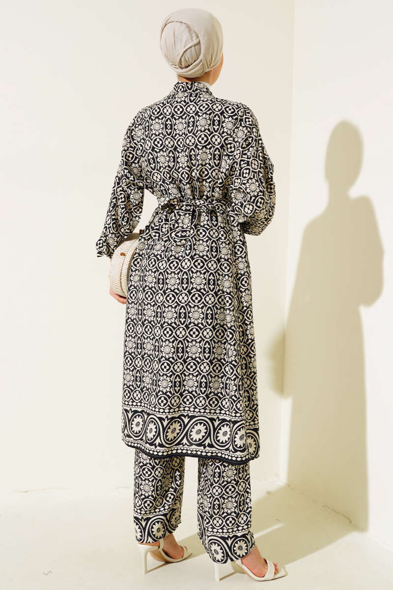 Gömlek Garnili Kuşaklı Çizgili Takım Siyah