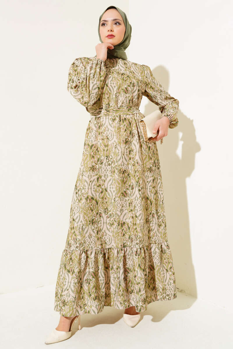 Metal Düğme Süslemeli Bağcıklı Elbise Vizon