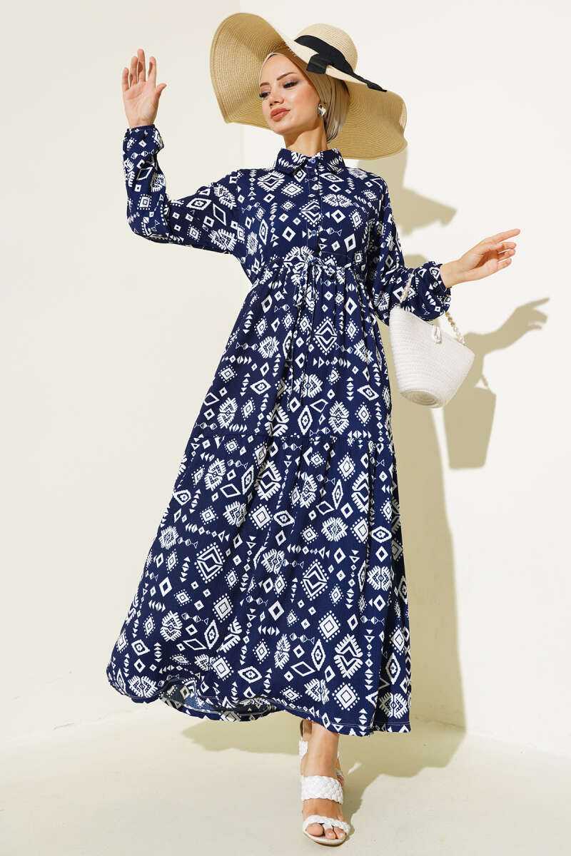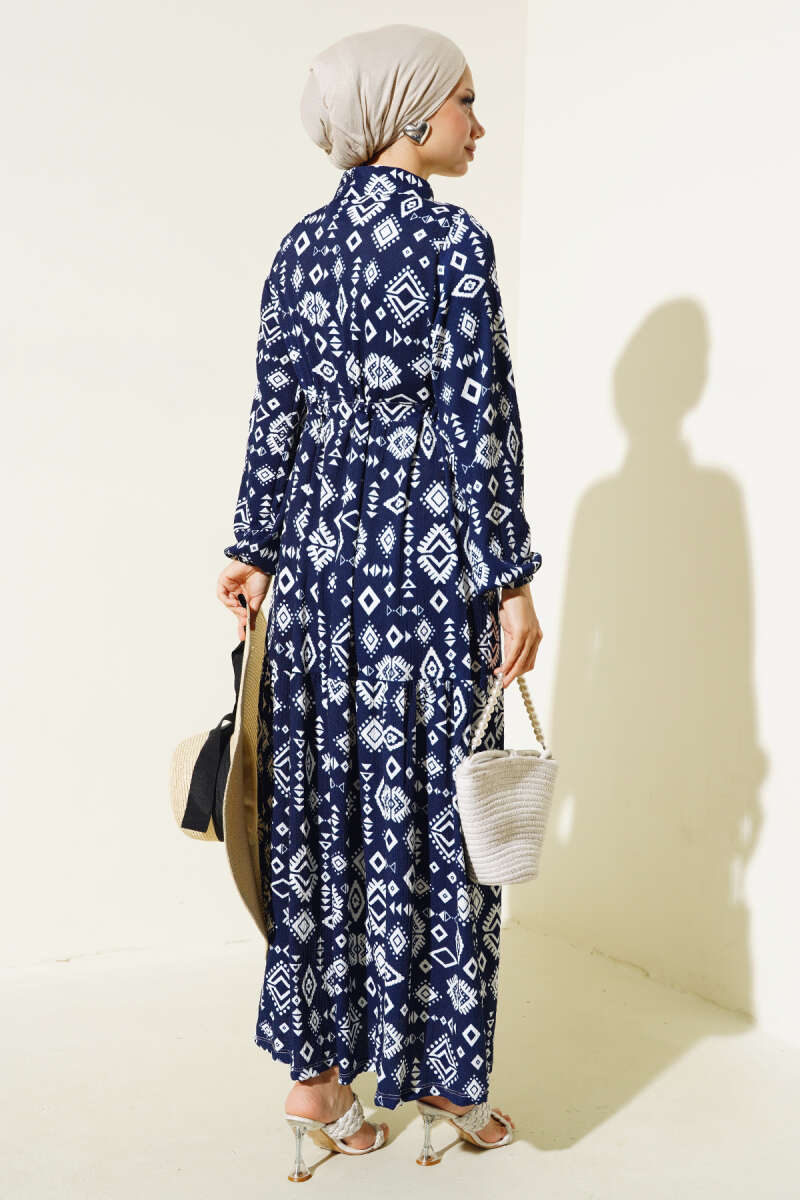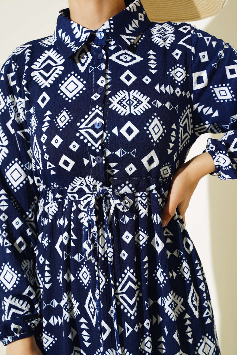 Karışık Desen Kruvaze Yaka Elbise İndigo