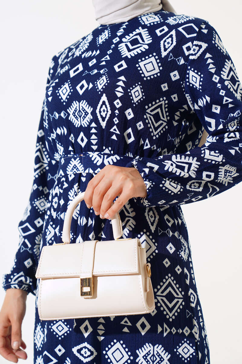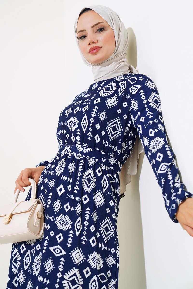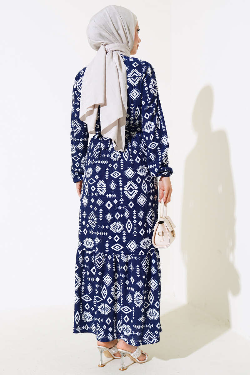 Etnik Desenli Bürümcük Elbise Lacivert
