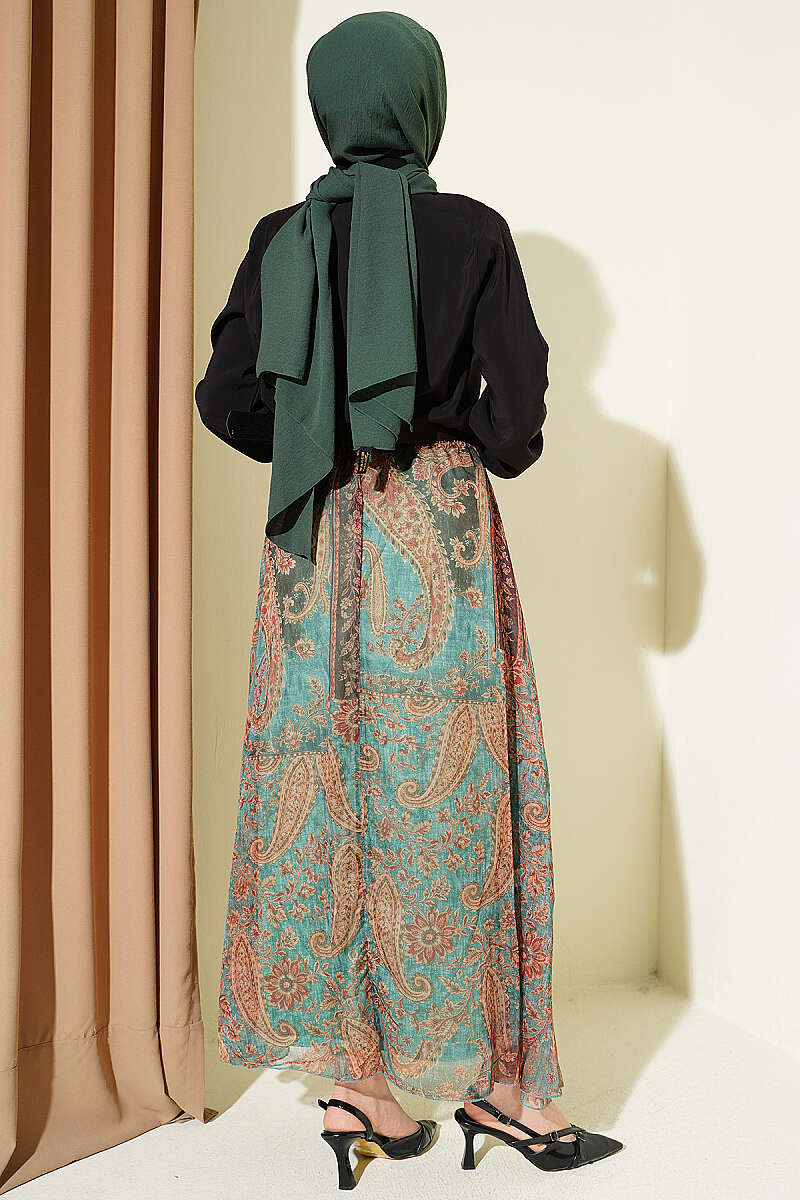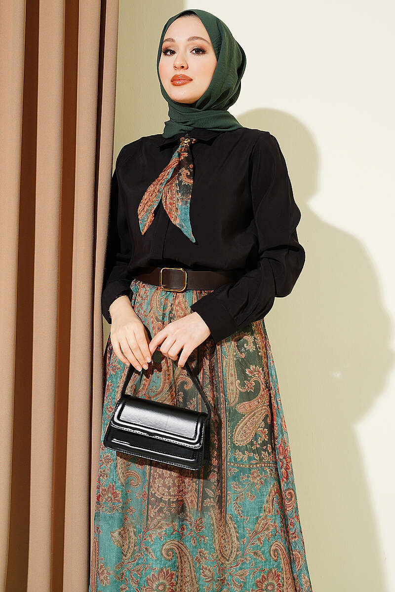 Etnik Desenli Fularlı Şifon Etekli Takım Siyah