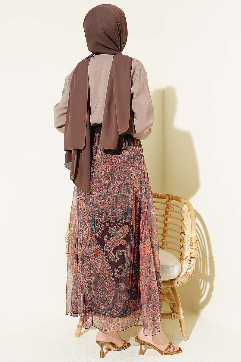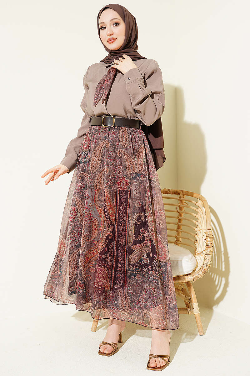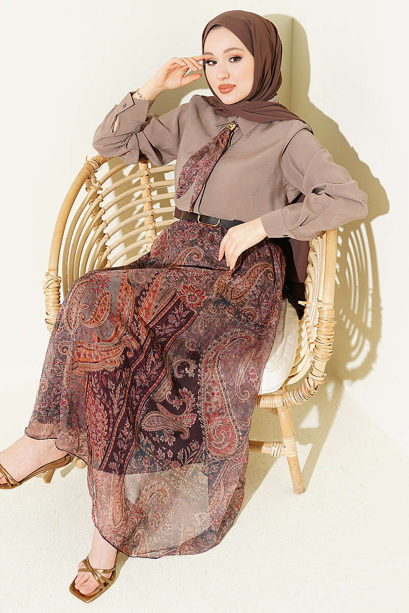 Etnik Desenli Fularlı Şifon Etekli Takım Vizon