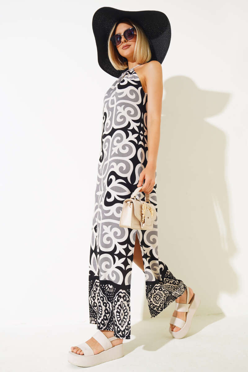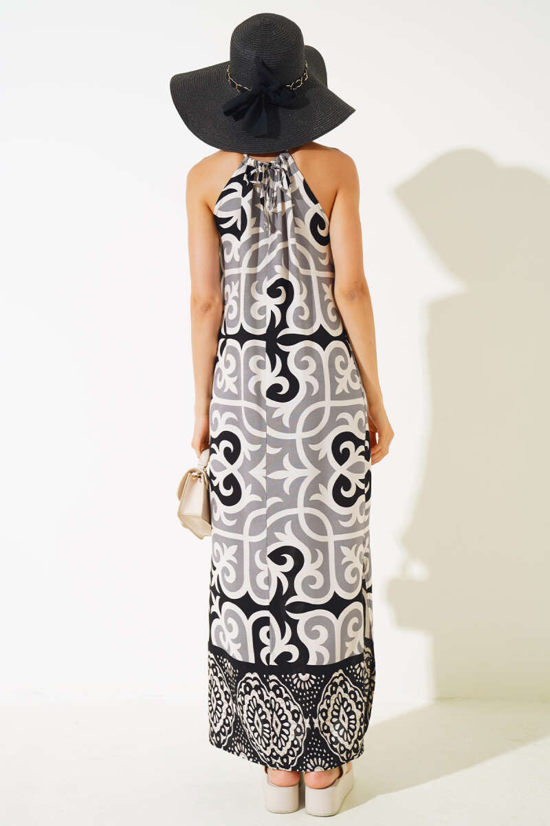 Yeni sezon elbisemiz etnik desenlidir. İp askılı elbisemizin askıları sayesinde yakası büzgülenebilmektedir. Etek uçlarının yanları derin yırtmaçlıdır. Yaz için favori olan elbisemiz mutlaka dolabınızda bulunmalıdır.