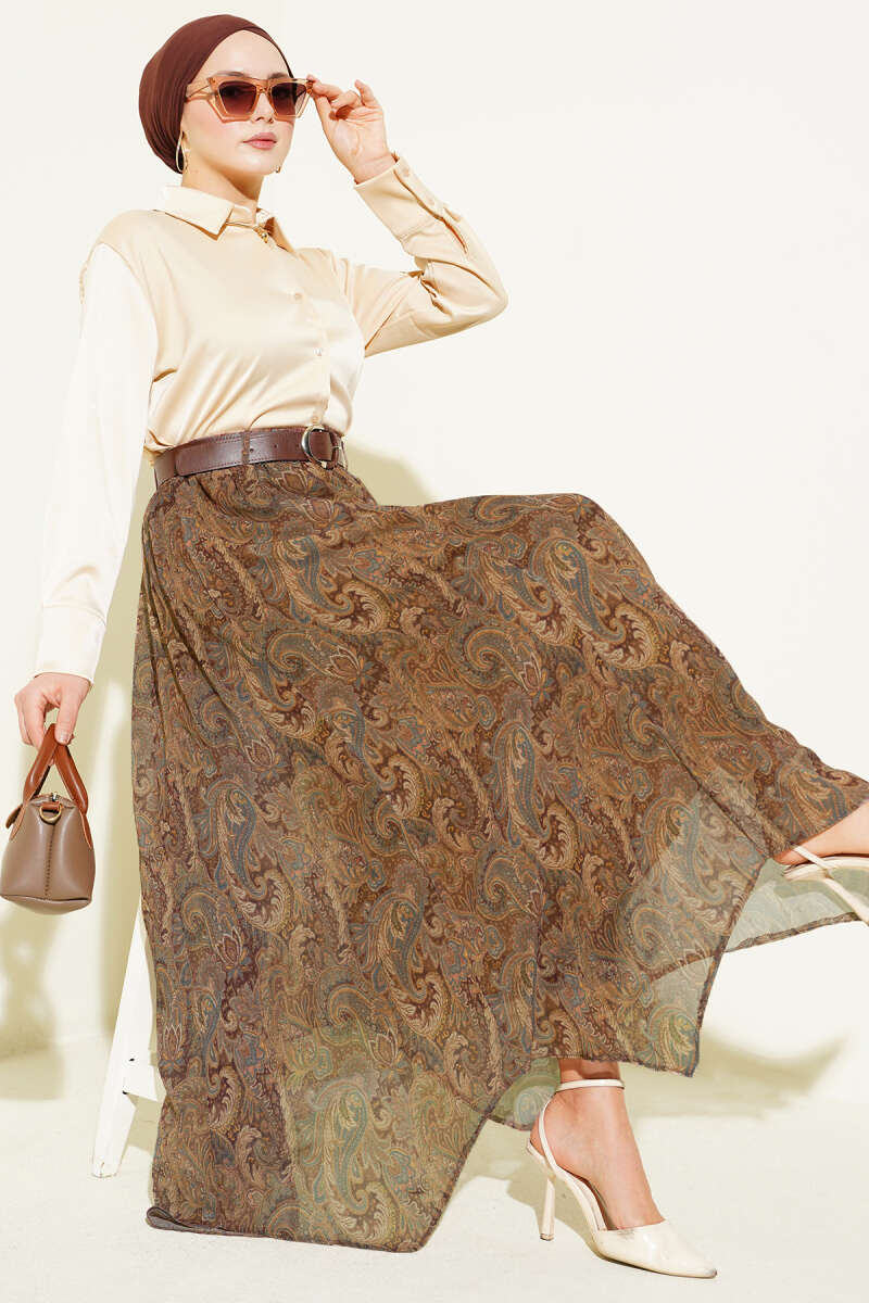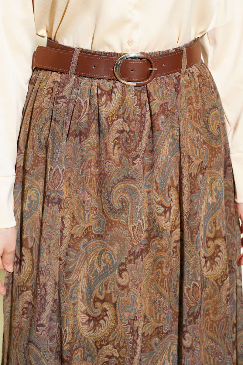 Etnik Desenli Kemerli Şifon Etek Camel