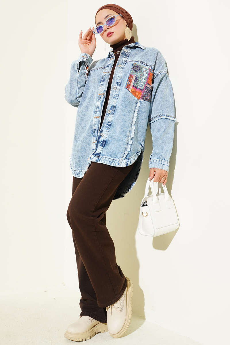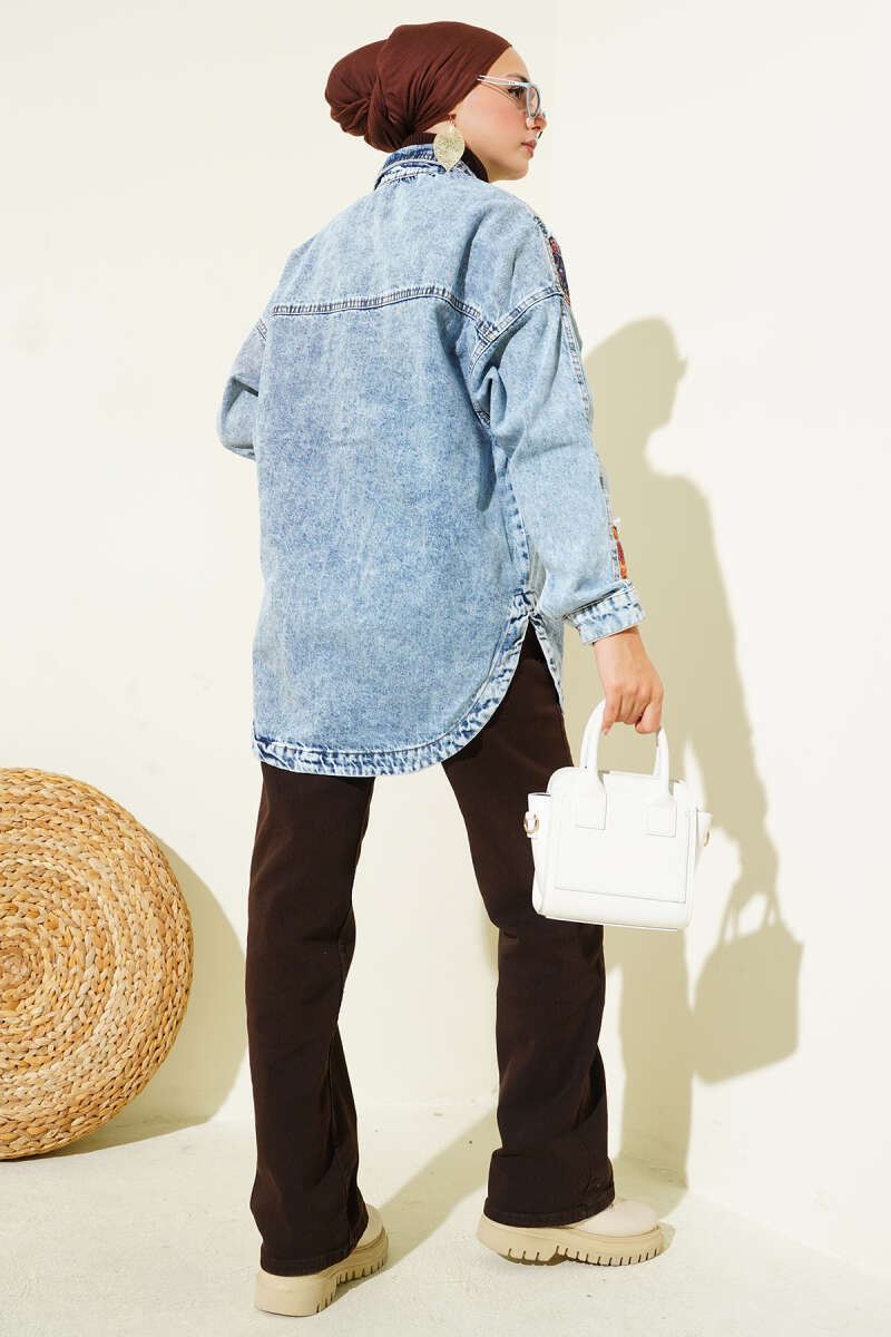 Etnik Desenli Püsküllü Kot Ceket Kot Mavisi