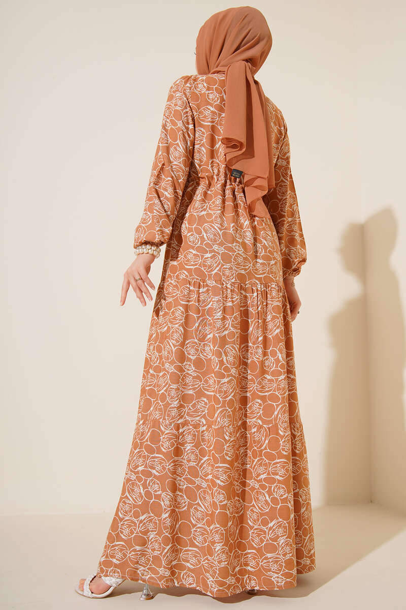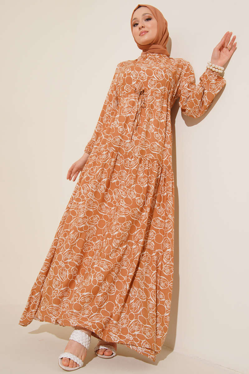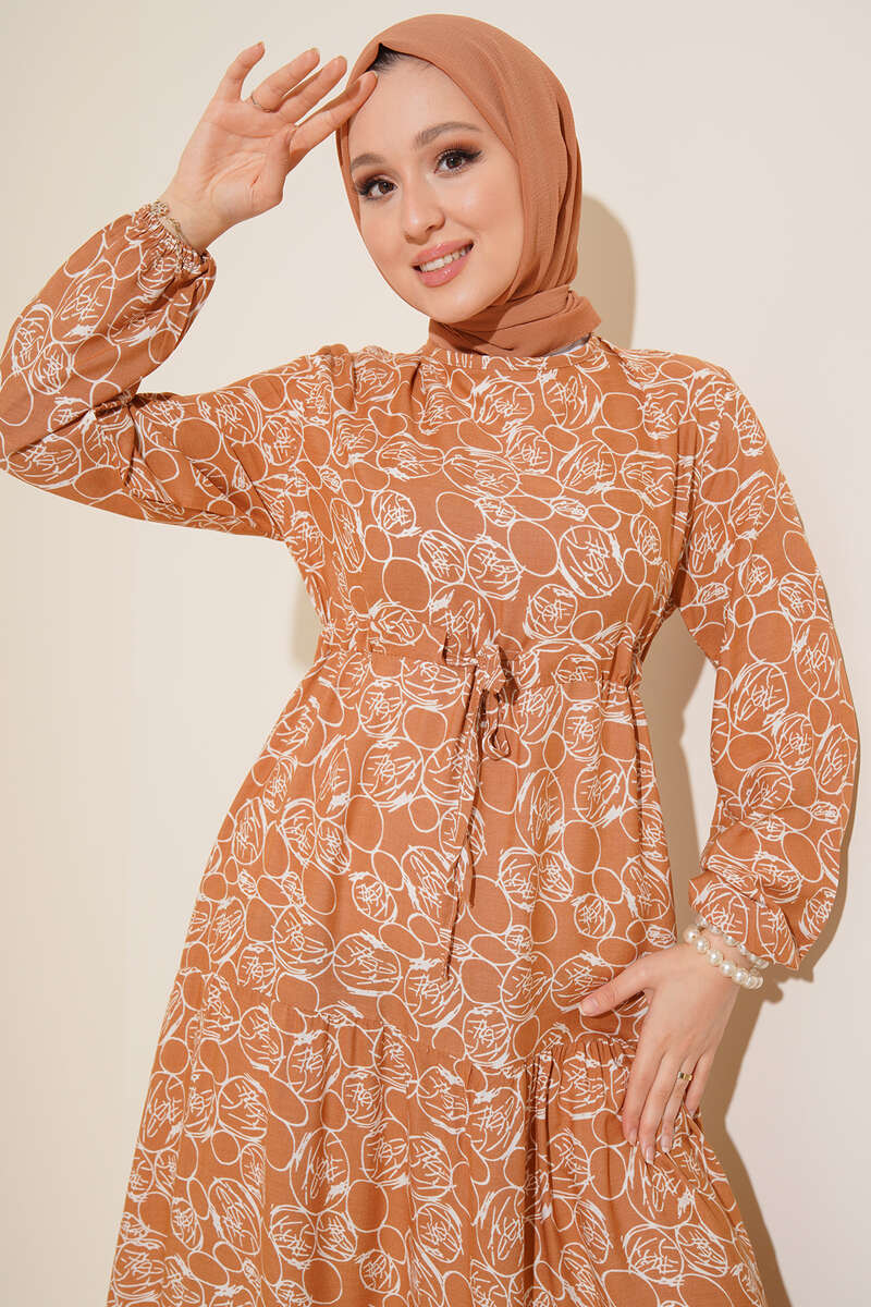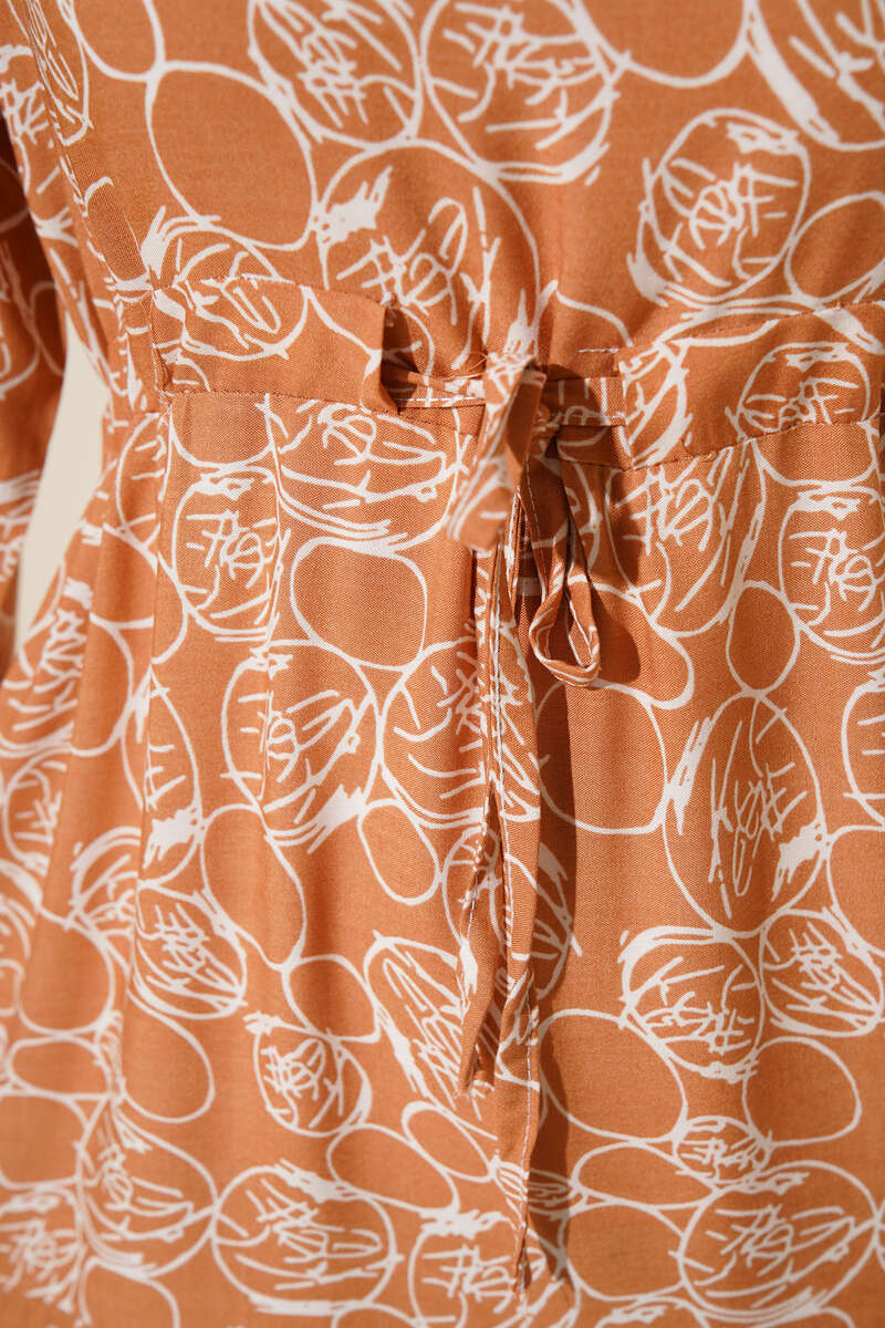 Etnik Desenli Tünelli İp Bağlamalı Elbise Camel