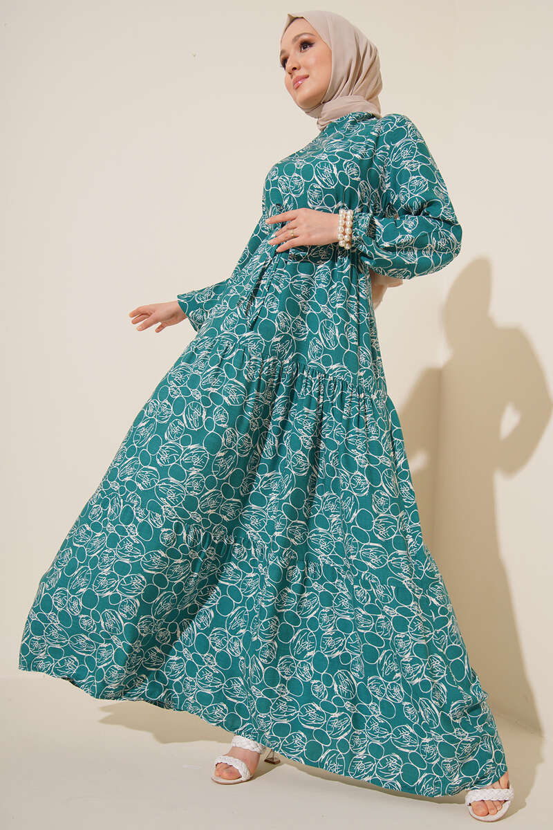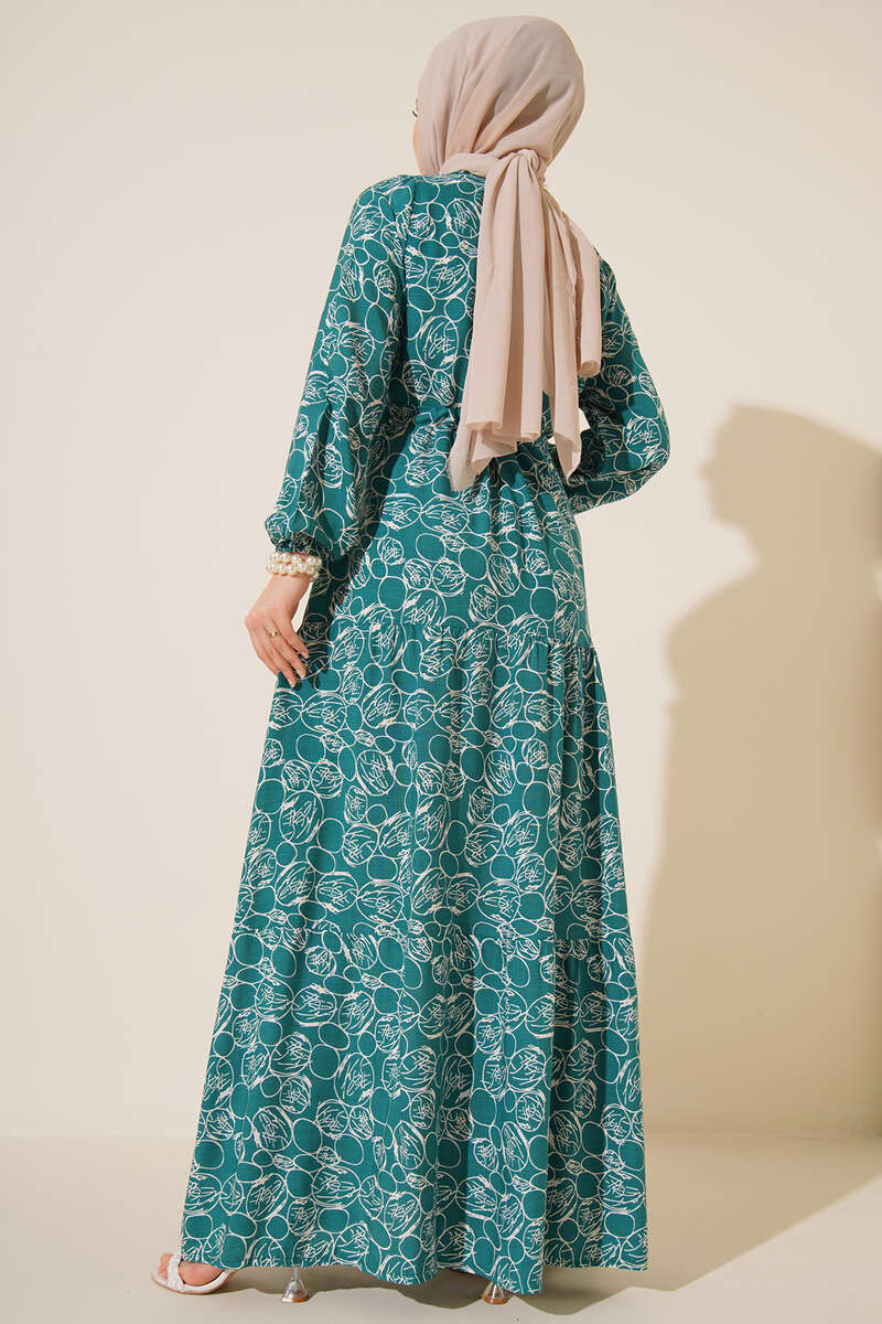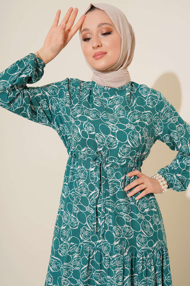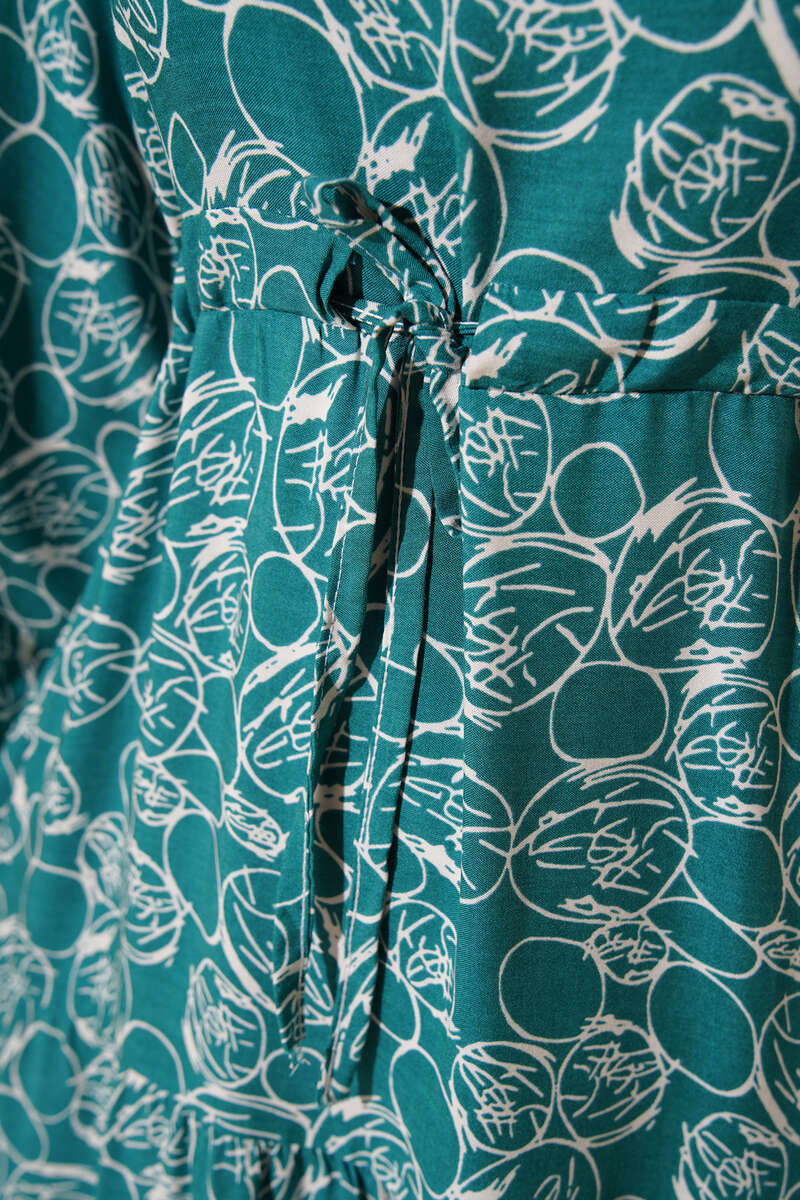 Etnik Desenli Tünelli İp Bağlamalı Elbise Petrol