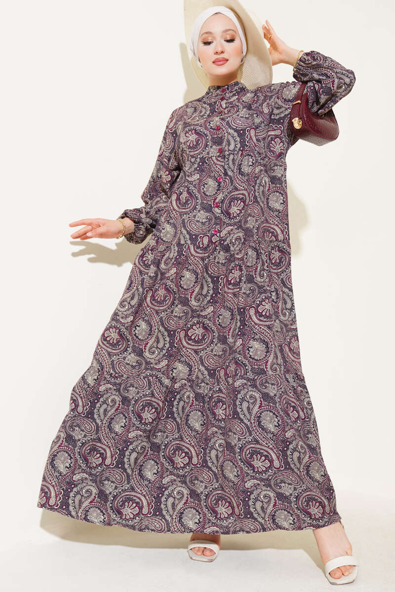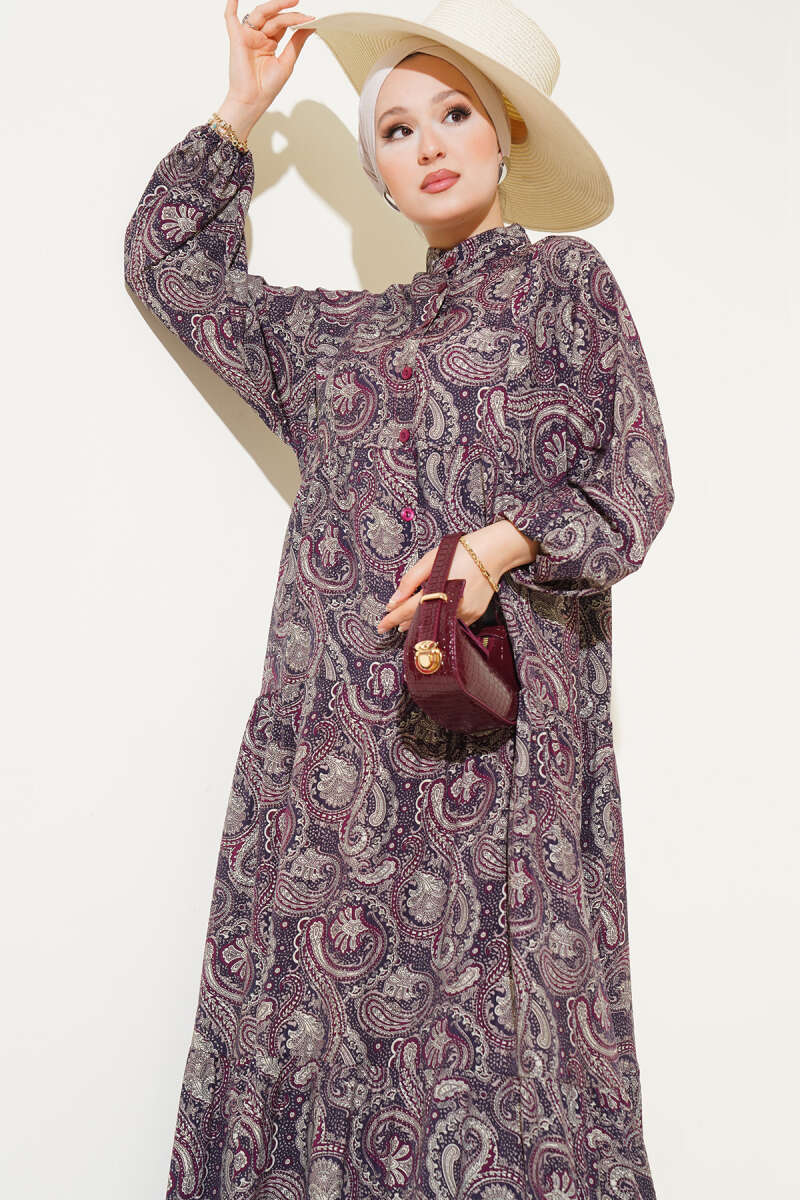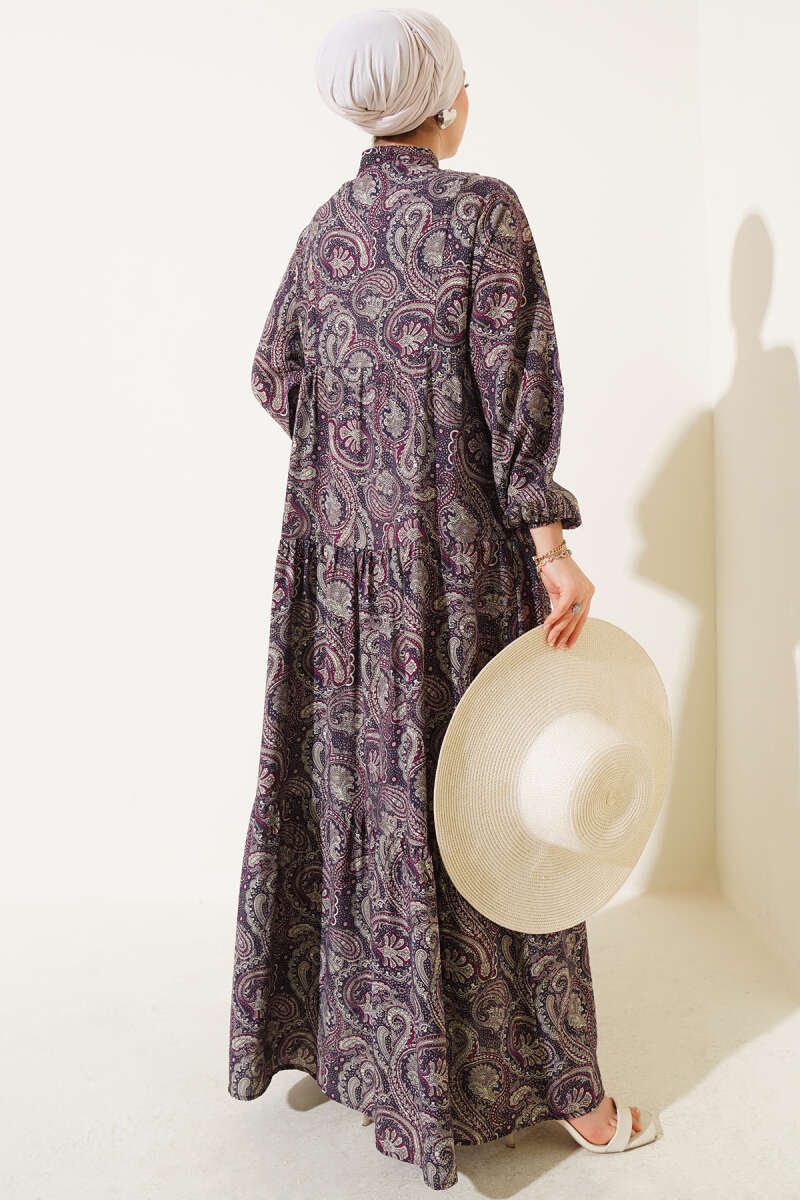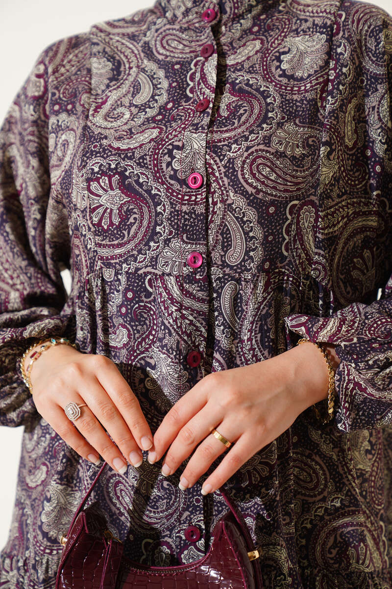 Etnik Paisley Desen Düğmeli Elbise Mor