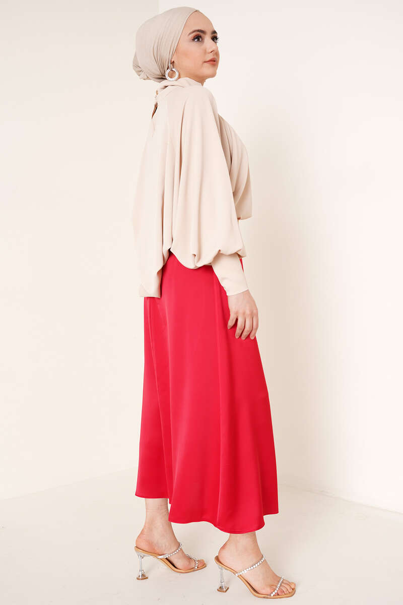 Evaze saten bordo eteğimiz belden etek ucuna doğru genişleyen yapıya sahiptir. Yarım fermuarlı olmasından dolayı kolay kullanıma uygundur. Bel kısmı manşetlidir. Parlak ve şık bir görünüme sahip olan ürünümüz tüm kombinlerinizde size kolaylıkla yardımcı olacaktır.