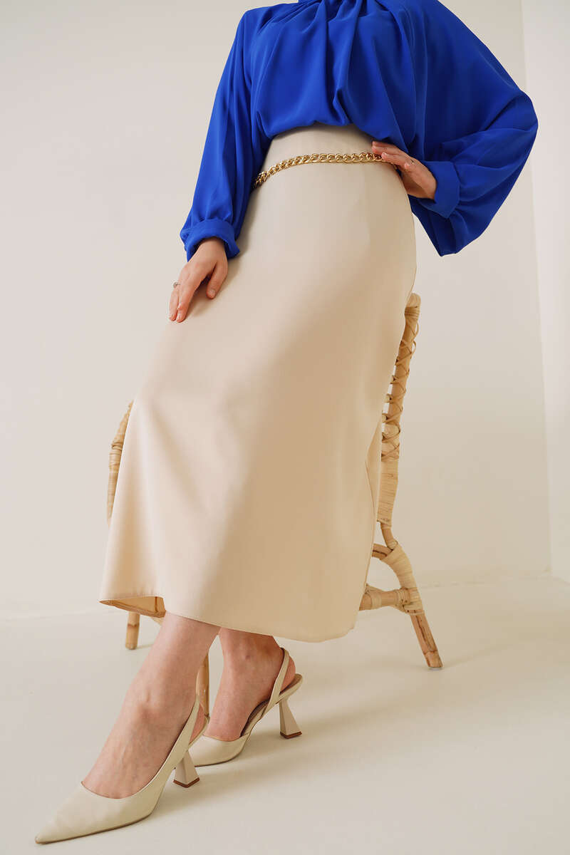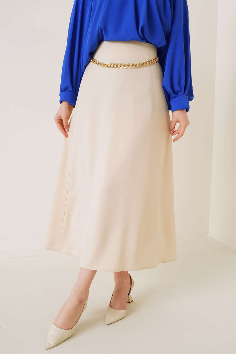 Evaze saten bej eteğimiz belden etek ucuna doğru genişleyen yapıya sahiptir. Yarım fermuarlı olmasından dolayı kolay kullanıma uygundur. Bel kısmı manşetlidir. Parlak ve şık bir görünüme sahip olan ürünümüz tüm kombinlerinizde size kolaylıkla yardımcı olacaktır.