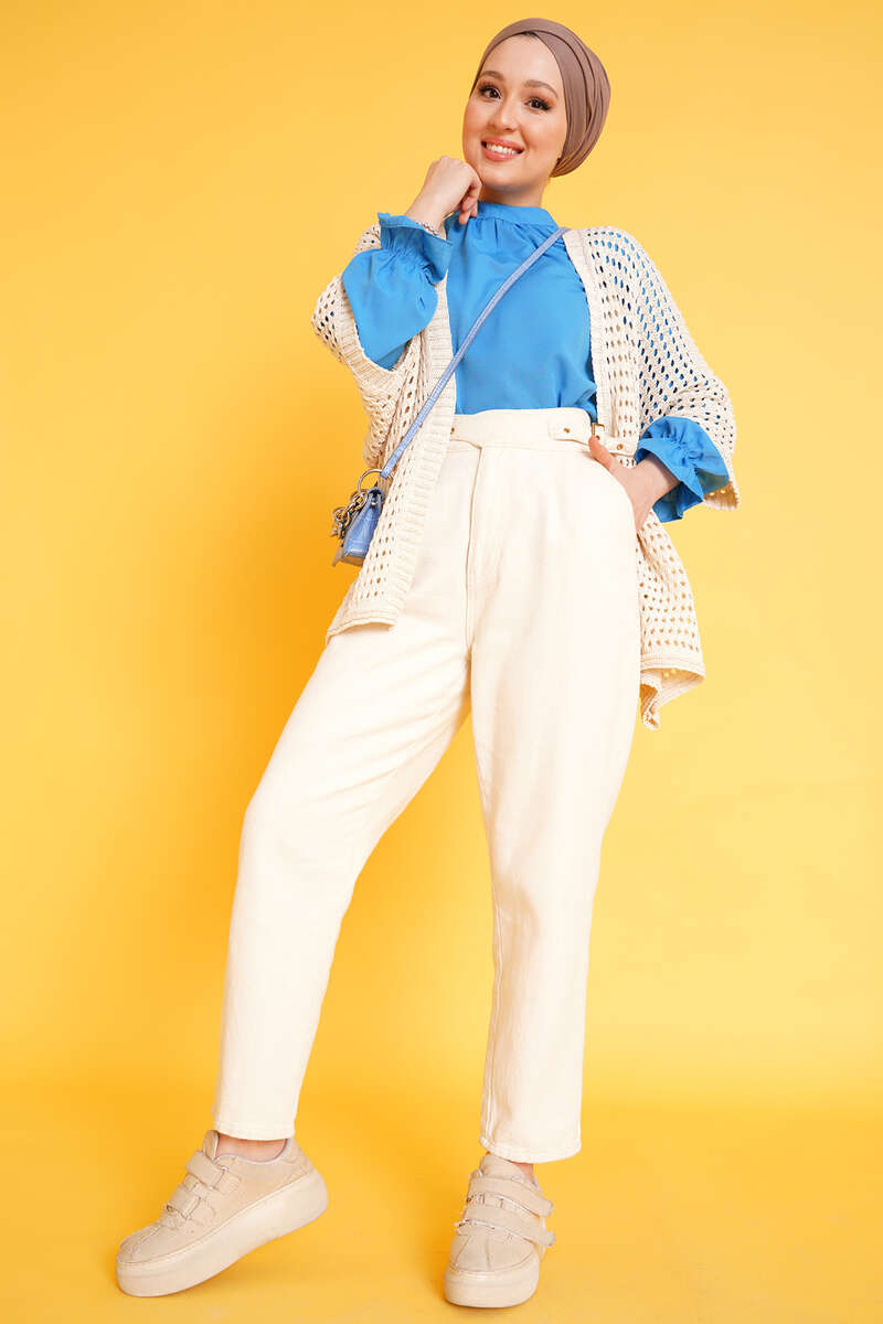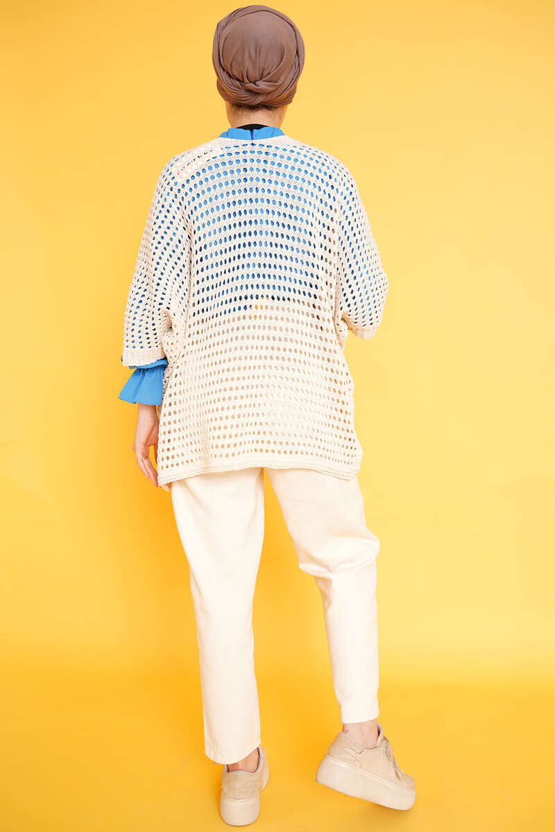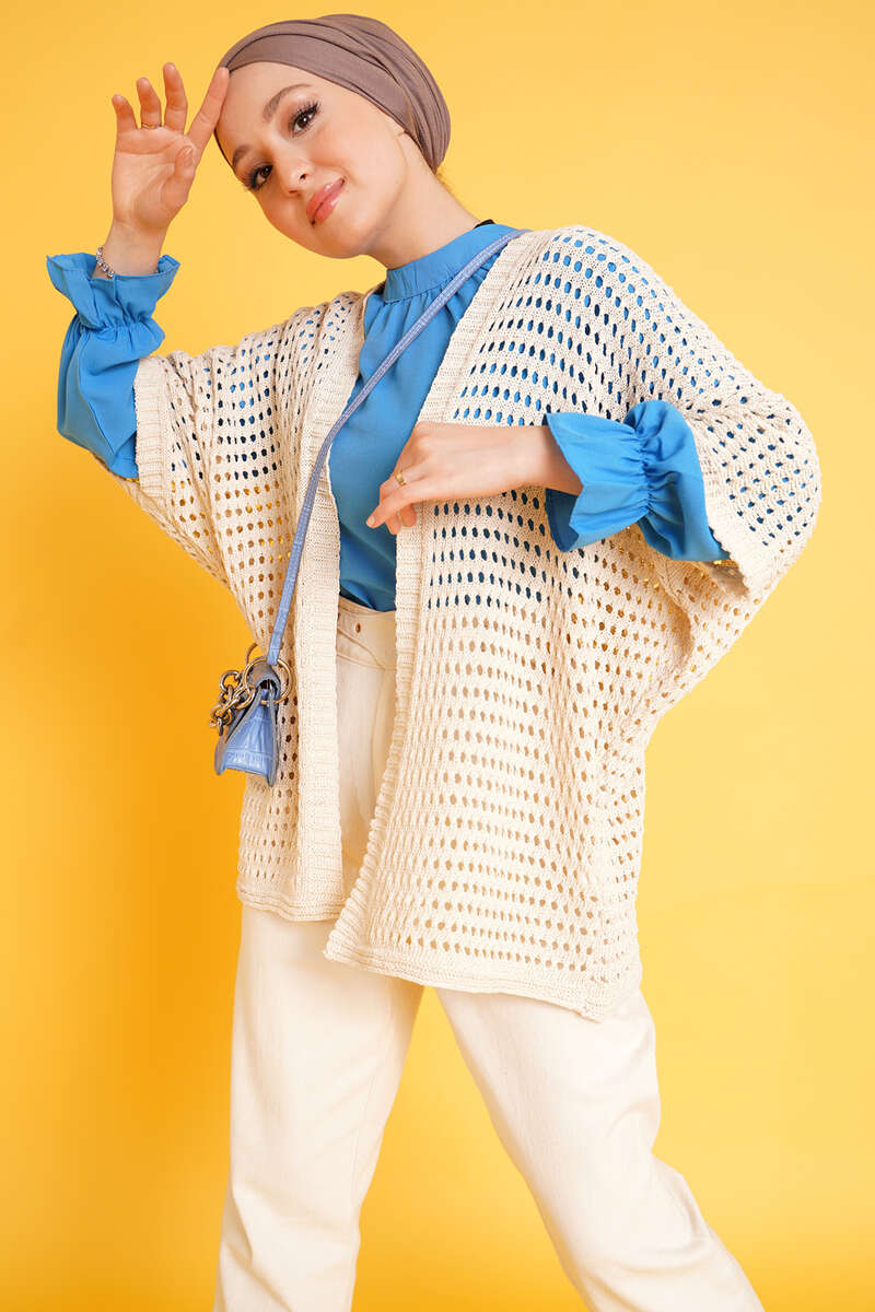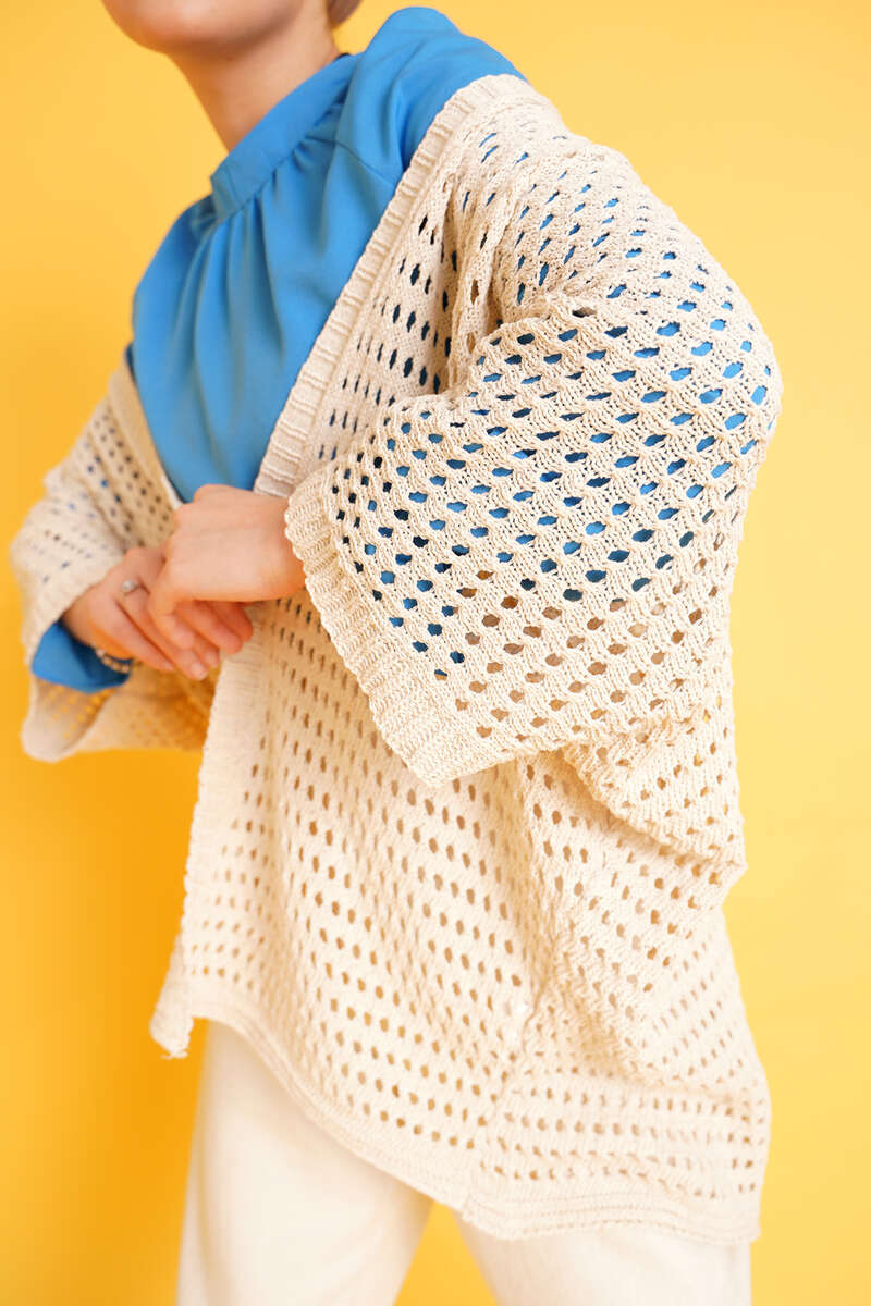Yeni sezon örgü hırkamız fakir kol modeldir. Cepsiz ve kuşaksız olan hırkamız yarasa koldur. Komibinlerinizde son dokunuşu yapacak hırkamız şık bir görünüm sunmaktadır.