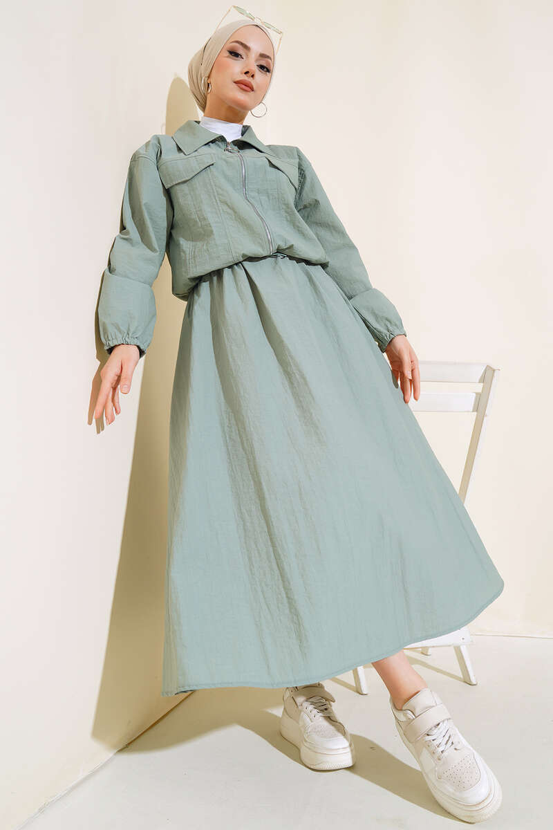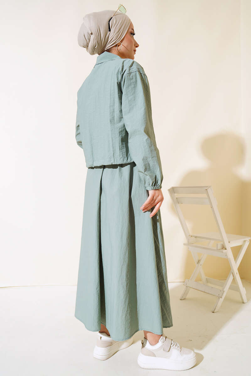 Yeni sezon ikili takımımız şık tarzıyla favoriniz olacak. Ceketimizin yakası gömlek yakadır. Belden lastiklidir. İki adet cep kapağı vardır. Boydan fermuarlıdır. Kol bilekleri lastiklidir. Eteğimizin beli lastiklidir. Bol ve salaş bir yapıya sahiptir. takımımızın renk seçenekleri mevcuttur.