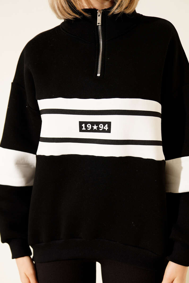 Fermuarlı 1994 Baskılı Üç İplik Swatshirt Siyah