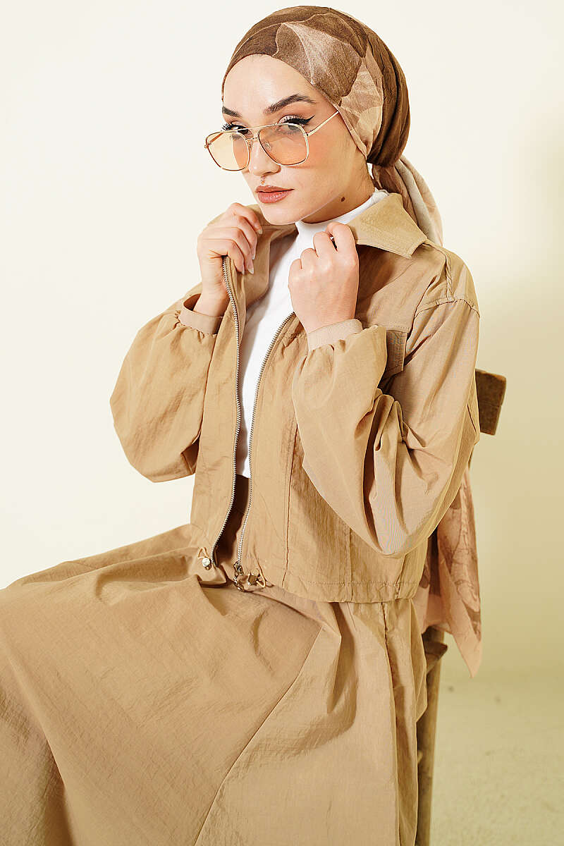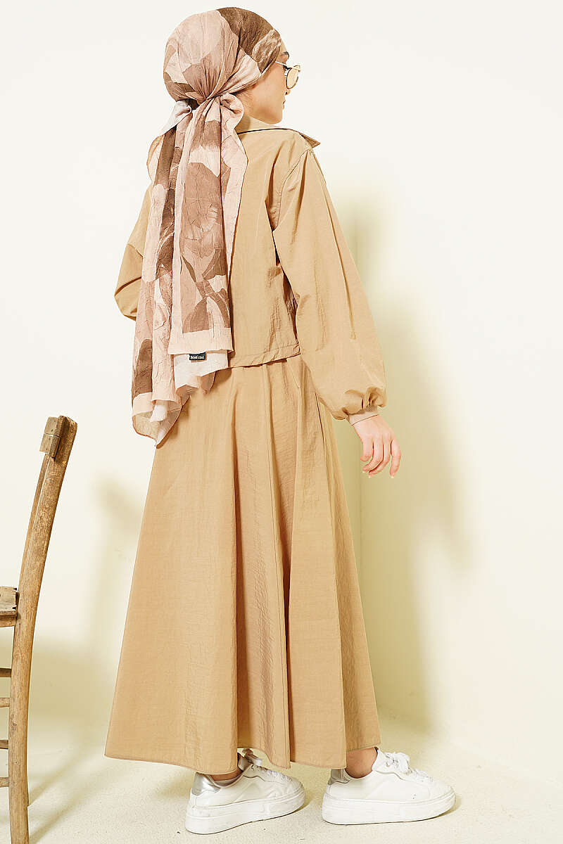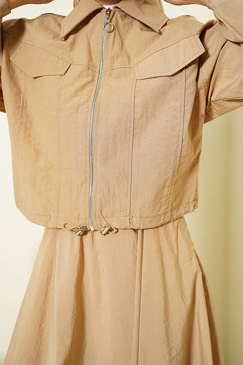 Fermuarlı Ceketli Etekli Paraşüt İkili Takım Bej