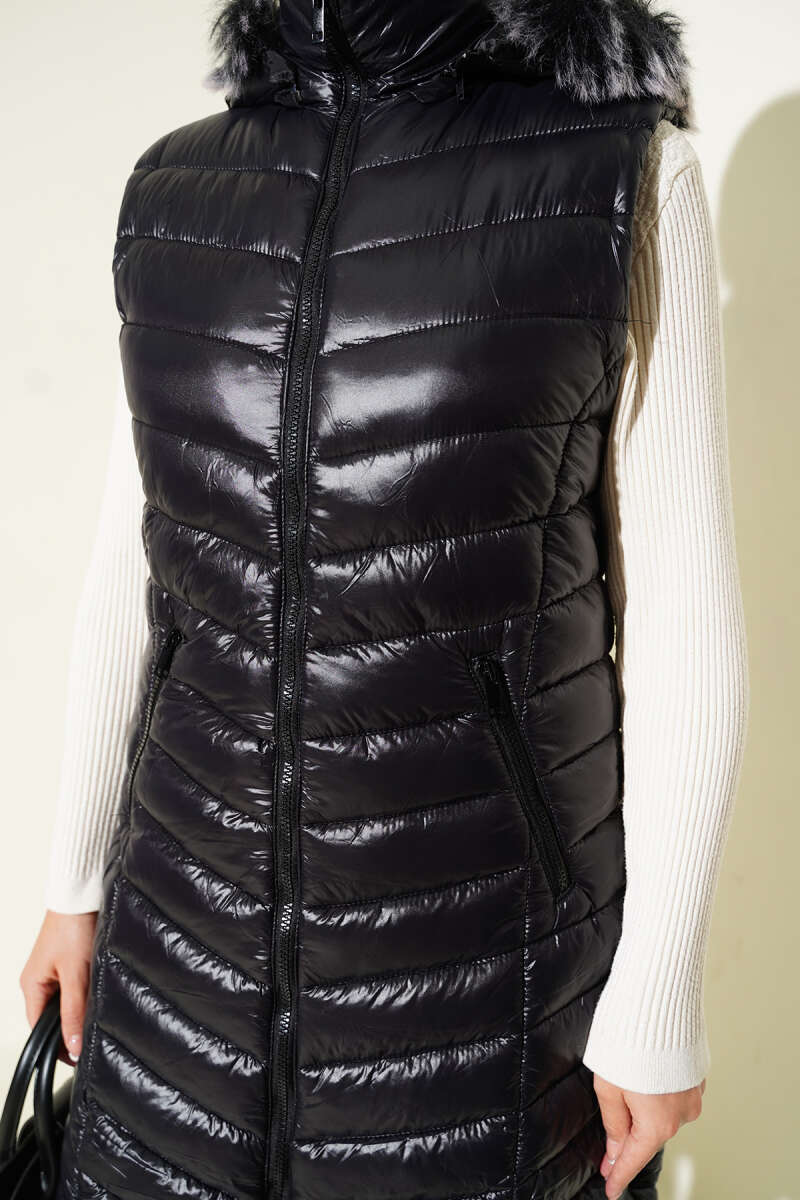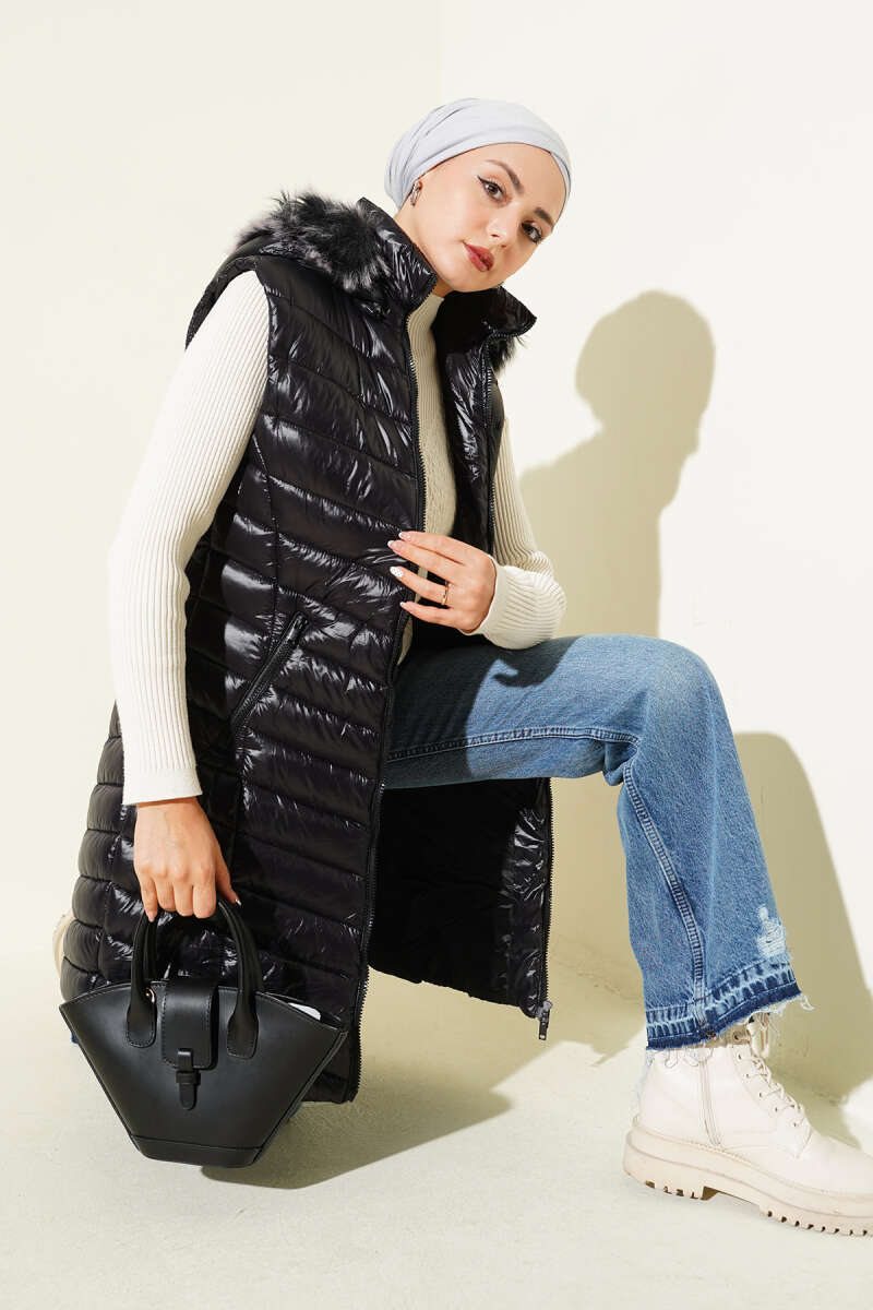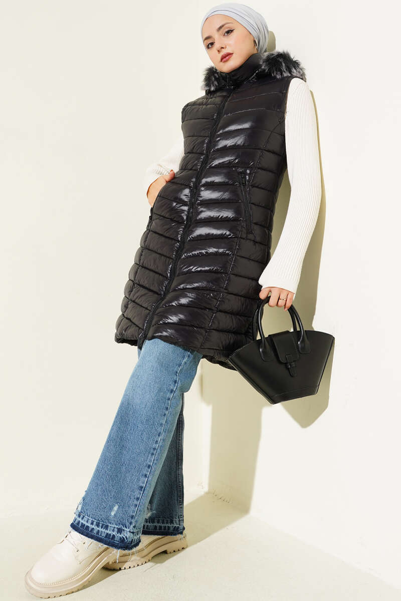 Fermuarlı Cepli Kapüşonlu Şişme Yelek Siyah