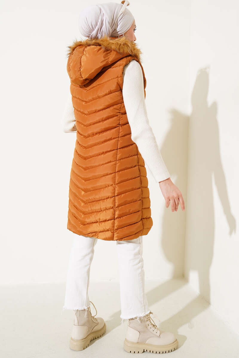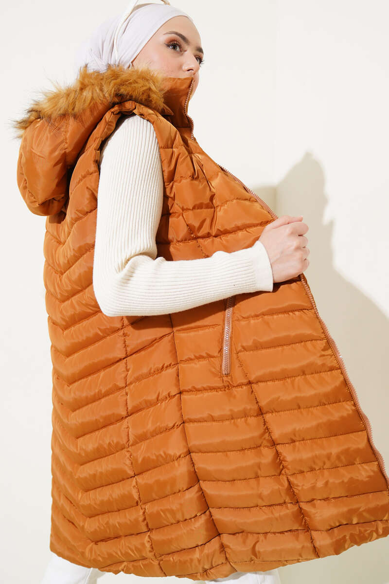 Fermuarlı Cepli Kapüşonlu Şişme Yelek Taba
